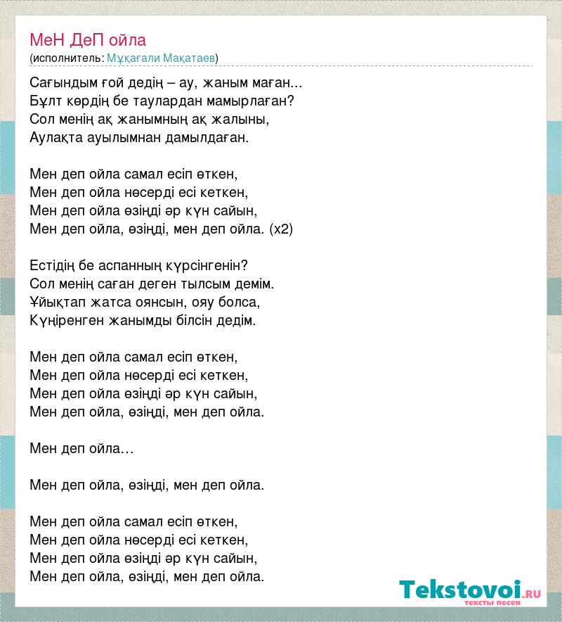 Сағындым ғой дедің – ау, жаным маған... Бұлт көрдің бе таулардан мамырлаған? Сол менің ақ жанымның ақ жалыны, Аулақта ауылымнан дамылдаған. Мен деп ойла самал есiп өткен, Мен деп ойла нөсердi есi кеткен, Мен деп ойла өзіңді әр күн сайын, Мен деп ойла, өзіңді, мен деп ойла. (х2) Естідің бе аспанның күрсінгенін? Сол менің саған деген тылсым демім. Ұйықтап жатса оянсын, ояу болса, Күңіренген жанымды білсін дедім. Мен деп ойла самал есiп өткен, Мен деп ойла нөсердi есi кеткен, Мен деп ойла өзіңді әр күн сайын, Мен деп ойла, өзіңді, мен деп ойла. Мен деп ойла… Мен деп ойла, өзіңді, мен деп ойла. Мен деп ойла самал есiп өткен, Мен деп ойла нөсердi есi кеткен, Мен деп ойла өзіңді әр күн сайын, Мен деп ойла, өзіңді, мен деп ойла.