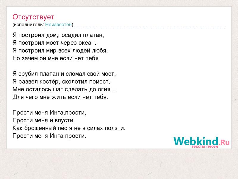 Я построил дом,посадил платан, Я построил мост через океан. Я построил мир всех людей любя, Но зачем он мне если нет тебя. Я срубил платан и сломал свой мост, Я развел костёр, сколотил помост. Мне осталось шаг сделать до огня... Для чего мне жить если нет тебя. Прости меня Инга,прости, Прости меня и впусти. Как брошенный пёс я не в силах ползти. Прости меня Инга прости.