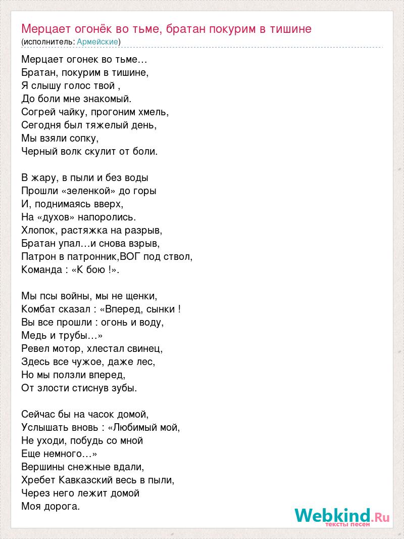 Мерцает огонек во тьме… Братан, покурим в тишине, Я слышу голос твой , До боли мне знакомый. Согрей чайку, прогоним хмель, Сегодня был тяжелый день, Мы взяли сопку, Черный волк скулит от боли. В жару, в пыли и без воды Прошли «зеленкой» до горы И, поднимаясь вверх, На «духов» напоролись. Хлопок, растяжка на разрыв, Братан упал…и снова взрыв, Патрон в патронник,ВОГ под ствол, Команда : «К бою !». Мы псы войны, мы не щенки, Комбат сказал : «Вперед, сынки ! Вы все прошли : огонь и воду, Медь и трубы…» Ревел мотор, хлестал свинец, Здесь все чужое, даже лес, Но мы ползли вперед, От злости стиснув зубы. Сейчас бы на часок домой, Услышать вновь : «Любимый мой, Не уходи, побудь со мной Еще немного…» Вершины снежные вдали, Хребет Кавказский весь в пыли, Через него лежит домой Моя дорога.