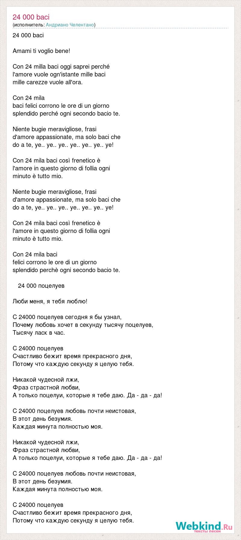 24 000 baci Amami ti voglio bene! Con 24 milla baci oggi saprei perché l'amore vuole ogn'istante mille baci mille carezze vuole all'ora. Con 24 mila baci felici corrono le ore di un giorno splendido perché ogni secondo bacio te. Niente bugie meravigliose, frasi d'amore appassionate, ma solo baci che do a te, ye.. ye.. ye.. ye.. ye.. ye.. ye! Con 24 mila baci così frenetico è l'amore in questo giorno di follia ogni minuto è tutto mio. Niente bugie meravigliose, frasi d'amore appassionate, ma solo baci che do a te, ye.. ye.. ye.. ye.. ye.. ye.. ye! Con 24 mila baci così frenetico è l'amore in questo giorno di follia ogni minuto è tutto mio. Con 24 mila baci felici corrono le ore di un giorno splendido perchè ogni secondo bacio te. 24 000 поцелуев Люби меня, я тебя люблю! С 24000 поцелуев cегодня я бы узнал, Почему любовь хочет в секунду тысячу поцелуев, Тысячу ласк в час. С 24000 поцелуев Счастливо бежит время прекрасного дня, Потому что каждую секунду я целую тебя. Никакой чудесной лжи, Фраз страстной любви, А только поцелуи, которые я тебе даю. Да - да - да! С 24000 поцелуев любовь почти неистовая, В этот день безумия. Каждая минута полностью моя. Никакой чудесной лжи, Фраз страстной любви, А только поцелуи, которые я тебе даю. Да - да - да! С 24000 поцелуев любовь почти неистовая, В этот день безумия. Каждая минута полностью моя. С 24000 поцелуев Счастливо бежит время прекрасного дня, Потому что каждую секунду я целую тебя.