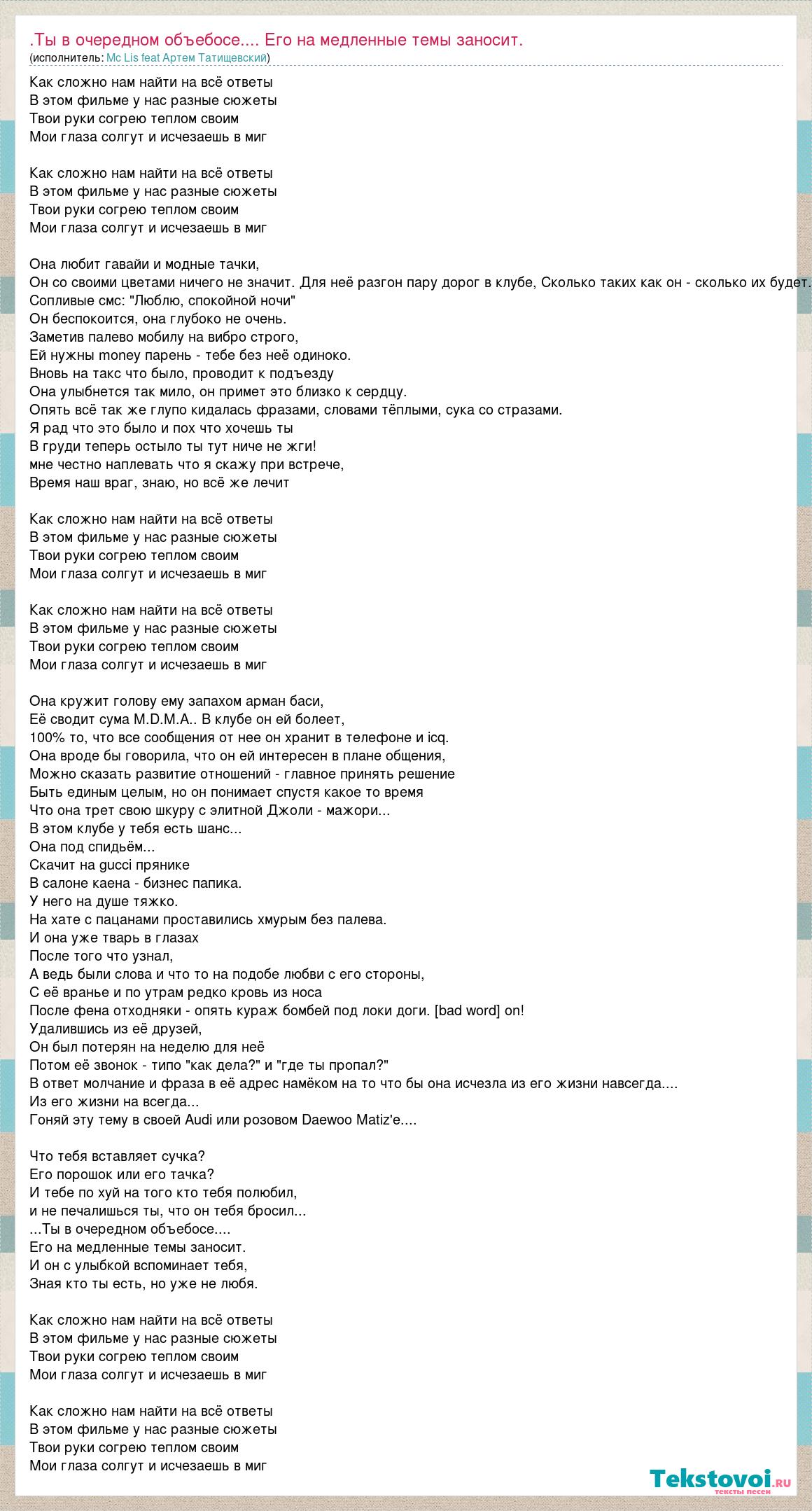 Как сложно нам найти на всё ответы В этом фильме у нас разные сюжеты Твои руки согрею теплом своим Мои глаза солгут и исчезаешь в миг Как сложно нам найти на всё ответы В этом фильме у нас разные сюжеты Твои руки согрею теплом своим Мои глаза солгут и исчезаешь в миг Она любит гавайи и модные тачки, Он со своими цветами ничего не значит. Для неё разгон пару дорог в клубе, Сколько таких как он - сколько их будет. Сопливые смс: "Люблю, спокойной ночи" Он беспокоится, она глубоко не очень. Заметив палево мобилу на вибро строго, Ей нужны money парень - тебе без неё одиноко. Вновь на такс что было, проводит к подъезду Она улыбнется так мило, он примет это близко к сердцу. Опять всё так же глупо кидалась фразами, словами тёплыми, сука со стразами. Я рад что это было и пох что хочешь ты В груди теперь остыло ты тут ниче не жги! мне честно наплевать что я скажу при встрече, Время наш враг, знаю, но всё же лечит Как сложно нам найти на всё ответы В этом фильме у нас разные сюжеты Твои руки согрею теплом своим Мои глаза солгут и исчезаешь в миг Как сложно нам найти на всё ответы В этом фильме у нас разные сюжеты Твои руки согрею теплом своим Мои глаза солгут и исчезаешь в миг Она кружит голову ему запахом арман баси, Её сводит сума M.D.M.A.. В клубе он ей болеет, 100% то, что все сообщения от нее он хранит в телефоне и icq. Она вроде бы говорила, что он ей интересен в плане общения, Можно сказать развитие отношений - главное принять решение Быть единым целым, но он понимает спустя какое то время Что она трет свою шкуру с элитной Джоли - мажори... В этом клубе у тебя есть шанс... Она под спидьём... Скачит на gucci прянике В салоне каена - бизнес папика. У него на душе тяжко. На хате с пацанами проставились хмурым без палева. И она уже тварь в глазах После того что узнал, А ведь были слова и что то на подобе любви с его стороны, С её вранье и по утрам редко кровь из носа После фена отходняки - опять кураж бомбей под локи доги. [bad word] on! Удалившись из её друзей, Он был потерян на неделю для неё Потом её звонок - типо "как дела?" и "где ты пропал?" В ответ молчание и фраза в её адрес намёком на то что бы она исчезла из его жизни навсегда.... Из его жизни на всегда... Гоняй эту тему в своей Audi или розовом Daewoo Matiz'е.... Что тебя вставляет сучка? Его порошок или его тачка? И тебе по хуй на того кто тебя полюбил, и не печалишься ты, что он тебя бросил... ...Ты в очередном объебосе.... Его на медленные темы заносит. И он с улыбкой вспоминает тебя, Зная кто ты есть, но уже не любя. Как сложно нам найти на всё ответы В этом фильме у нас разные сюжеты Твои руки согрею теплом своим Мои глаза солгут и исчезаешь в миг Как сложно нам найти на всё ответы В этом фильме у нас разные сюжеты Твои руки согрею теплом своим Мои глаза солгут и исчезаешь в миг
