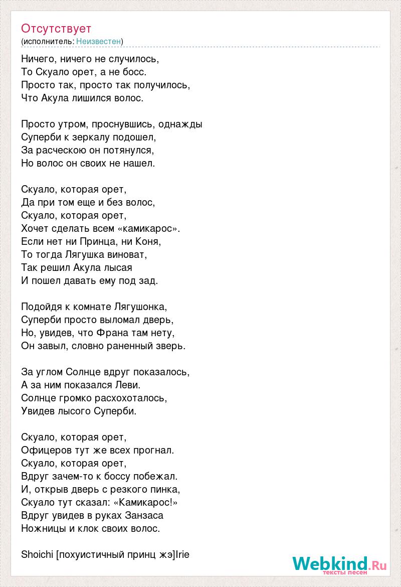 Ничего, ничего не случилось, То Скуало орет, а не босс. Просто так, просто так получилось, Что Акула лишился волос. Просто утром, проснувшись, однажды Суперби к зеркалу подошел, За расческою он потянулся, Но волос он своих не нашел. Скуало, которая орет, Да при том еще и без волос, Скуало, которая орет, Хочет сделать всем «камикарос». Если нет ни Принца, ни Коня, То тогда Лягушка виноват, Так решил Акула лысая И пошел давать ему под зад. Подойдя к комнате Лягушонка, Суперби просто выломал дверь, Но, увидев, что Франа там нету, Он завыл, словно раненный зверь. За углом Солнце вдруг показалось, А за ним показался Леви. Солнце громко расхохоталось, Увидев лысого Суперби. Скуало, которая орет, Офицеров тут же всех прогнал. Скуало, которая орет, Вдруг зачем-то к боссу побежал. И, открыв дверь с резкого пинка, Скуало тут сказал: «Камикарос!» Вдруг увидев в руках Занзаса Ножницы и клок своих волос. Shoichi [похуистичный принц жэ]Irie