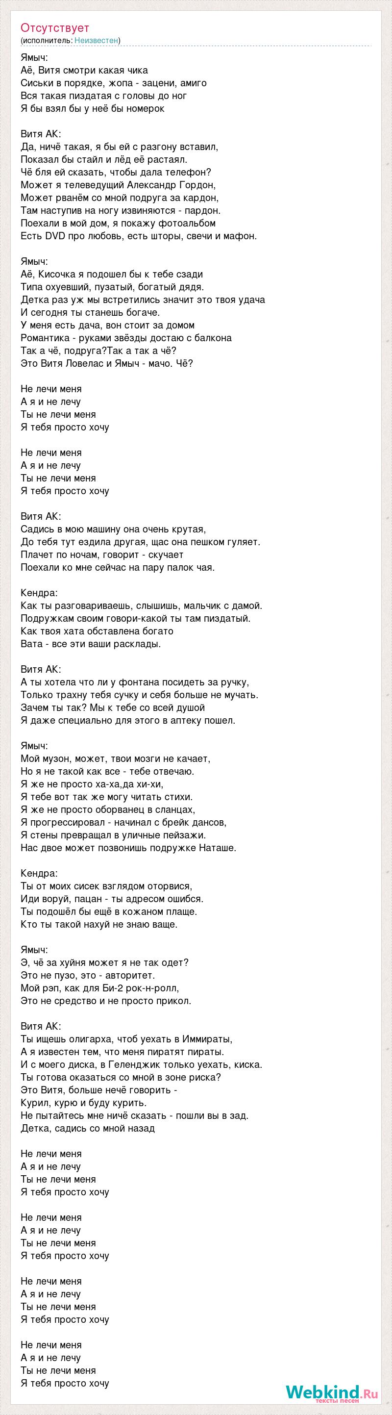 Ямыч: Аё, Витя смотри какая чика Сиськи в порядке, жопа - зацени, амиго Вся такая пиздатая с головы до ног Я бы взял бы у неё бы номерок Витя АК: Да, ничё такая, я бы ей с разгону вставил, Показал бы стайл и лёд её растаял. Чё бля ей сказать, чтобы дала телефон? Может я телеведущий Александр Гордон, Может рванём со мной подруга за кардон, Там наступив на ногу извиняются - пардон. Поехали в мой дом, я покажу фотоальбом Есть DVD про любовь, есть шторы, свечи и мафон. Ямыч: Аё, Кисочка я подошел бы к тебе сзади Типа охуевший, пузатый, богатый дядя. Детка раз уж мы встретились значит это твоя удача И сегодня ты станешь богаче. У меня есть дача, вон стоит за домом Романтика - руками звёзды достаю с балкона Так а чё, подруга?Так а так а чё? Это Витя Ловелас и Ямыч - мачо. Чё? Не лечи меня А я и не лечу Ты не лечи меня Я тебя просто хочу Не лечи меня А я и не лечу Ты не лечи меня Я тебя просто хочу Витя АК: Садись в мою машину она очень крутая, До тебя тут ездила другая, щас она пешком гуляет. Плачет по ночам, говорит - скучает Поехали ко мне сейчас на пару палок чая. Кендра: Как ты разговариваешь, слышишь, мальчик с дамой. Подружкам своим говори-какой ты там пиздатый. Как твоя хата обставлена богато Вата - все эти ваши расклады. Витя АК: А ты хотела что ли у фонтана посидеть за ручку, Только трахну тебя сучку и себя больше не мучать. Зачем ты так? Мы к тебе со всей душой Я даже специально для этого в аптеку пошел. Ямыч: Мой музон, может, твои мозги не качает, Но я не такой как все - тебе отвечаю. Я же не просто ха-ха,да хи-хи, Я тебе вот так же могу читать стихи. Я же не просто оборванец в сланцах, Я прогрессировал - начинал с брейк дансов, Я стены превращал в уличные пейзажи. Нас двое может позвонишь подружке Наташе. Кендра: Ты от моих сисек взглядом оторвися, Иди воруй, пацан - ты адресом ошибся. Ты подошёл бы ещё в кожаном плаще. Кто ты такой нахуй не знаю ваще. Ямыч: Э, чё за хуйня может я не так одет? Это не пузо, это - авторитет. Мой рэп, как для Би-2 рок-н-ролл, Это не средство и не просто прикол. Витя АК: Ты ищешь олигарха, чтоб уехать в Иммираты, А я известен тем, что меня пиратят пираты. И с моего диска, в Геленджик только уехать, киска. Ты готова оказаться со мной в зоне риска? Это Витя, больше нечё говорить - Курил, курю и буду курить. Не пытайтесь мне ничё сказать - пошли вы в зад. Детка, садись со мной назад Не лечи меня А я и не лечу Ты не лечи меня Я тебя просто хочу Не лечи меня А я и не лечу Ты не лечи меня Я тебя просто хочу Не лечи меня А я и не лечу Ты не лечи меня Я тебя просто хочу Не лечи меня А я и не лечу Ты не лечи меня Я тебя просто хочу