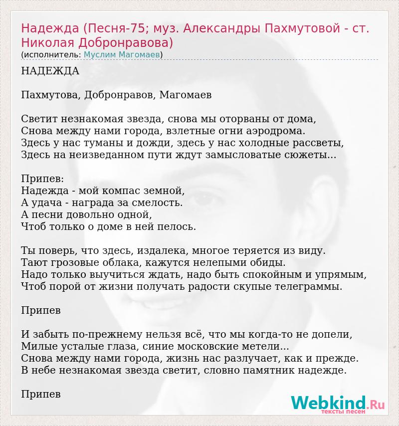 НАДЕЖДА Пахмутова, Добронравов, Магомаев Светит незнакомая звезда, снова мы оторваны от дома, Снова между нами города, взлетные огни аэродрома. Здесь у нас туманы и дожди, здесь у нас холодные рассветы, Здесь на неизведанном пути ждут замысловатые сюжеты... Припев: Надежда - мой компас земной, А удача - награда за смелость. А песни довольно одной, Чтоб только о доме в ней пелось. Ты поверь, что здесь, издалека, многое теряется из виду. Тают грозовые облака, кажутся нелепыми обиды. Надо только выучиться ждать, надо быть спокойным и упрямым, Чтоб порой от жизни получать радости скупые телеграммы. Припев И забыть по-прежнему нельзя всё, что мы когда-то не допели, Милые усталые глаза, синие московские метели... Снова между нами города, жизнь нас разлучает, как и прежде. В небе незнакомая звезда светит, словно памятник надежде. Припев