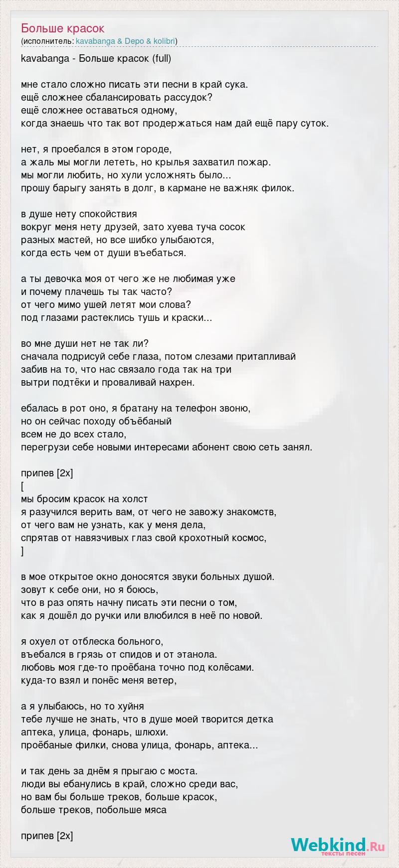 kavabanga - Больше красок (full) мне стало сложно писать эти песни в край сука. ещё сложнее сбалансировать рассудок? ещё сложнее оставаться одному, когда знаешь что так вот продержаться нам дай ещё пару суток. нет, я проебался в этом городе, а жаль мы могли лететь, но крылья захватил пожар. мы могли любить, но хули усложнять было... прошу барыгу занять в долг, в кармане не важняк филок. в душе нету спокойствия вокруг меня нету друзей, зато хуева туча сосок разных мастей, но все шибко улыбаются, когда есть чем от души въебаться. а ты девочка моя от чего же не любимая уже и почему плачешь ты так часто? от чего мимо ушей летят мои слова? под глазами растеклись тушь и краски... во мне души нет не так ли? сначала подрисуй себе глаза, потом слезами притапливай забив на то, что нас связало года так на три вытри подтёки и проваливай нахрен. ебалась в рот оно, я братану на телефон звоню, но он сейчас походу объёбаный всем не до всех стало, перегрузи себе новыми интересами абонент свою сеть занял. припев [2х] [ мы бросим красок на холст я разучился верить вам, от чего не завожу знакомств, от чего вам не узнать, как у меня дела, спрятав от навязчивых глаз свой крохотный космос, ] в мое открытое окно доносятся звуки больных душой. зовут к себе они, но я боюсь, что в раз опять начну писать эти песни о том, как я дошёл до ручки или влюбился в неё по новой. я охуел от отблеска больного, въебался в грязь от спидов и от этанола. любовь моя где-то проёбана точно под колёсами. куда-то взял и понёс меня ветер, а я улыбаюсь, но то хуйня тебе лучше не знать, что в душе моей творится детка аптека, улица, фонарь, шлюхи. проёбаные филки, снова улица, фонарь, аптека... и так день за днём я прыгаю с моста. люди вы ебанулись в край, сложно среди вас, но вам бы больше треков, больше красок, больше треков, побольше мяса припев [2х]