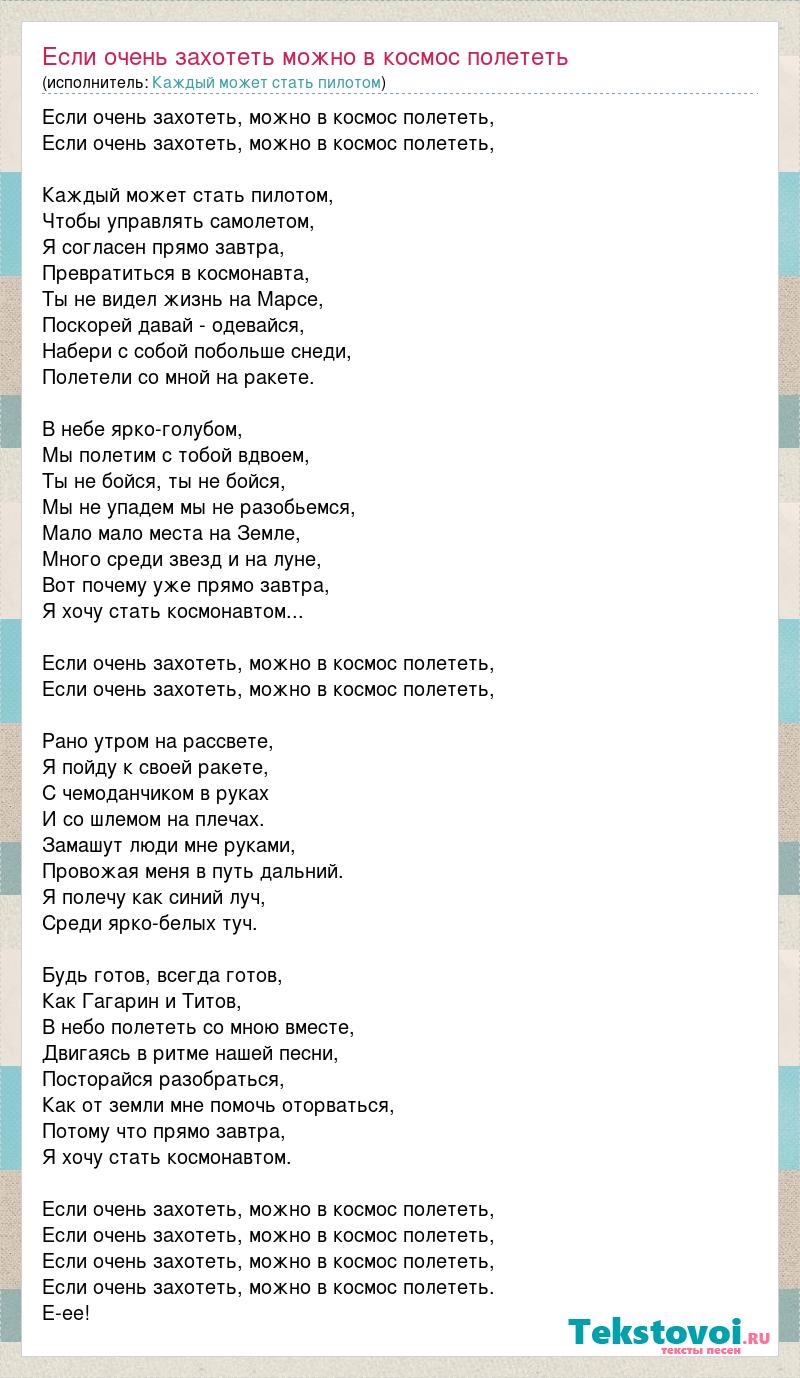 Если очень захотеть, можно в космос полететь, Если очень захотеть, можно в космос полететь, Каждый может стать пилотом, Чтобы управлять самолетом, Я согласен прямо завтра, Превратиться в космонавта, Ты не видел жизнь на Марсе, Поскорей давай - одевайся, Набери с собой побольше снеди, Полетели со мной на ракете. В небе ярко-голубом, Мы полетим с тобой вдвоем, Ты не бойся, ты не бойся, Мы не упадем мы не разобьемся, Мало мало места на Земле, Много среди звезд и на луне, Вот почему уже прямо завтра, Я хочу стать космонавтом... Если очень захотеть, можно в космос полететь, Если очень захотеть, можно в космос полететь, Рано утром на рассвете, Я пойду к своей ракете, С чемоданчиком в руках И со шлемом на плечах. Замашут люди мне руками, Провожая меня в путь дальний. Я полечу как синий луч, Среди ярко-белых туч. Будь готов, всегда готов, Как Гагарин и Титов, В небо полететь со мною вместе, Двигаясь в ритме нашей песни, Посторайся разобраться, Как от земли мне помочь оторваться, Потому что прямо завтра, Я хочу стать космонавтом. Если очень захотеть, можно в космос полететь, Если очень захотеть, можно в космос полететь, Если очень захотеть, можно в космос полететь, Если очень захотеть, можно в космос полететь. Е-ее!