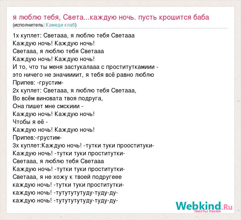 1х куплет: Светааа, я люблю тебя Светааа Каждую ночь! Каждую ночь! Светааа, я люблю тебя Светааа Каждую ночь! Каждую ночь! И то, что ты меня застукалааа с проституткамиии - это ничего не значиииит, я тебя всё равно люблю Припев: -грустим- 2х куплет: Светааа, я люблю тебя Светааа, Во всём виновата твоя подруга, Она пишет мне смскиии - Каждую ночь! Каждую ночь! Чтобы я её - Каждую ночь! Каждую ночь! Припев:-грустим- 3х куплет:Каждую ночь! -тутки туки прооституки- Каждую ночь! -тутки туки проститутки- Светааа, я люблю тебя Светааа Каждую ночь! -тутки туки проститутки- Светааа, я не хожу к твоей подругеее каждую ночь! -тутки туки проститутки- каждую ночь! -тутутутутуду-туду-ду- каждую ночь! -тутутутутуду-туду-ду-