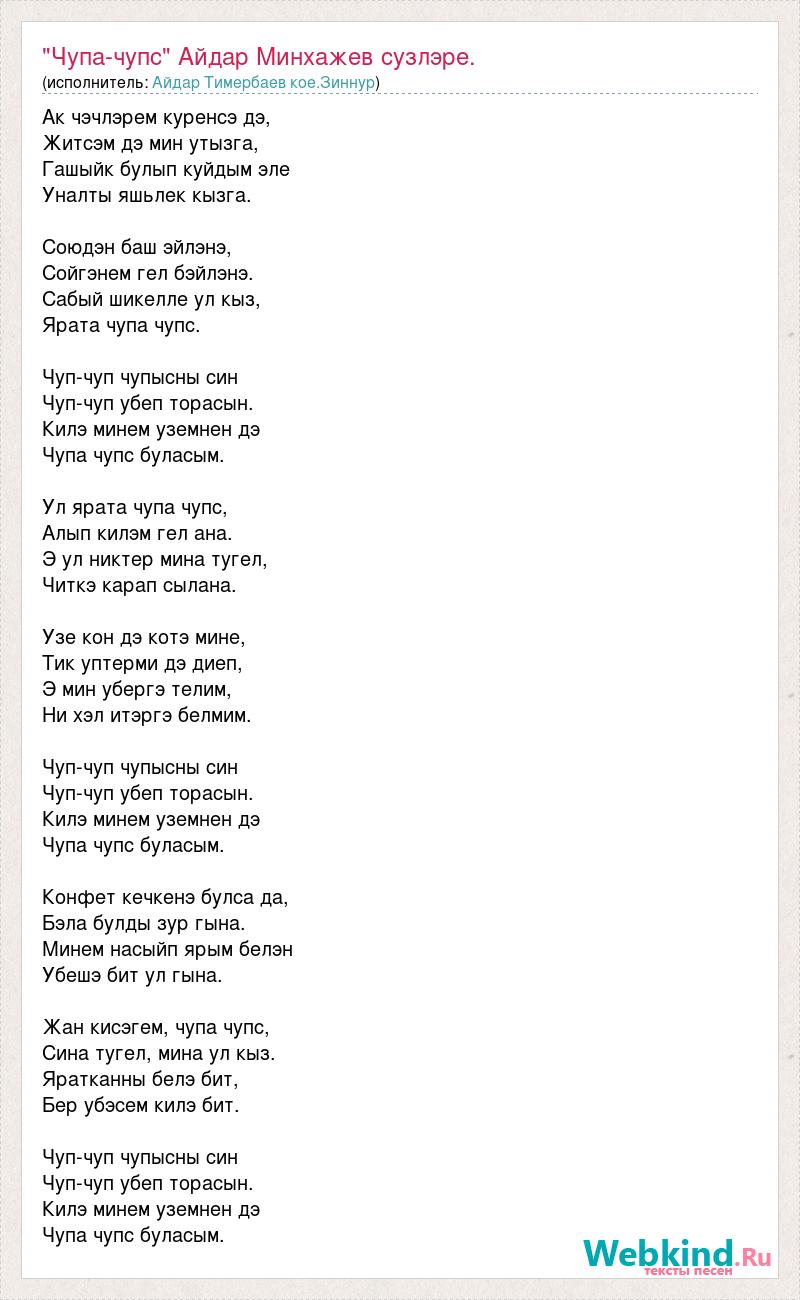 Ак чэчлэрем куренсэ дэ, Житсэм дэ мин утызга, Гашыйк булып куйдым эле Уналты яшьлек кызга. Союдэн баш эйлэнэ, Сойгэнем гел бэйлэнэ. Сабый шикелле ул кыз, Ярата чупа чупс. Чуп-чуп чупысны син Чуп-чуп убеп торасын. Килэ минем уземнен дэ Чупа чупс буласым. Ул ярата чупа чупс, Алып килэм гел ана. Э ул никтер мина тугел, Читкэ карап сылана. Узе кон дэ котэ мине, Тик уптерми дэ диеп, Э мин убергэ телим, Ни хэл итэргэ белмим. Чуп-чуп чупысны син Чуп-чуп убеп торасын. Килэ минем уземнен дэ Чупа чупс буласым. Конфет кечкенэ булса да, Бэла булды зур гына. Минем насыйп ярым белэн Убешэ бит ул гына. Жан кисэгем, чупа чупс, Сина тугел, мина ул кыз. Яратканны белэ бит, Бер убэсем килэ бит. Чуп-чуп чупысны син Чуп-чуп убеп торасын. Килэ минем уземнен дэ Чупа чупс буласым.