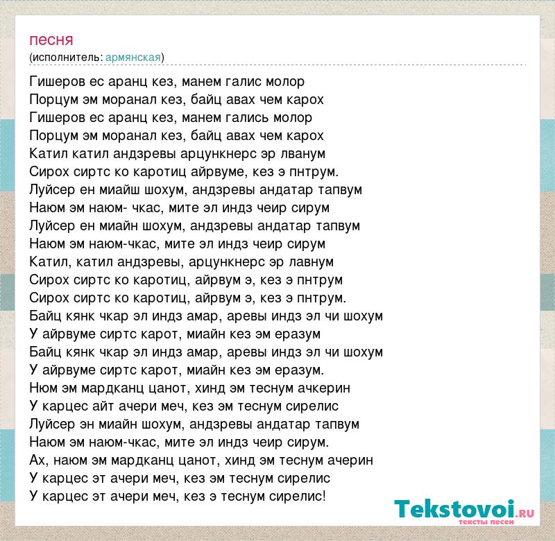 Гишеров ес аранц кез, манем галис молор Порцум эм моранал кез, байц авах чем карох Гишеров ес аранц кез, манем гались молор Порцум эм моранал кез, байц авах чем карох Катил катил андзревы арцункнерс эр лванум Сирох сиртс ко каротиц айрвуме, кез э пнтрум. Луйсер ен миайш шохум, андзревы андатар тапвум Наюм эм наюм- чкас, мите эл индз чеир сирум Луйсер ен миайн шохум, андзревы андатар тапвум Наюм эм наюм-чкас, мите эл индз чеир сирум Катил, катил андзревы, арцункнерс эр лавнум Сирох сиртс ко каротиц, айрвум э, кез э пнтрум Сирох сиртс ко каротиц, айрвум э, кез э пнтрум. Байц кянк чкар эл индз амар, аревы индз эл чи шохум У айрвуме сиртс карот, миайн кез эм еразум Байц кянк чкар эл индз амар, аревы индз эл чи шохум У айрвуме сиртс карот, миайн кез эм еразум. Нюм эм мардканц цанот, хинд эм теснум ачкерин У карцес айт ачери меч, кез эм теснум сирелис Луйсер эн миайн шохум, андзревы андатар тапвум Наюм эм наюм-чкас, мите эл индз чеир сирум. Ах, наюм эм мардканц цанот, хинд эм теснум ачерин У карцес эт ачери меч, кез эм теснум сирелис У карцес эт ачери меч, кез э теснум сирелис!