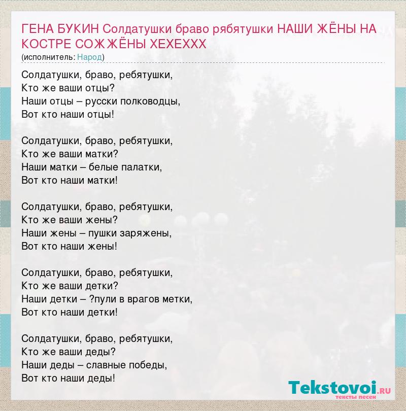 Солдатушки, браво, ребятушки, Кто же ваши отцы? Наши отцы – русски полководцы, Вот кто наши отцы! Солдатушки, браво, ребятушки, Кто же ваши матки? Наши матки – белые палатки, Вот кто наши матки! Солдатушки, браво, ребятушки, Кто же ваши жены? Наши жены – пушки заряжены, Вот кто наши жены! Солдатушки, браво, ребятушки, Кто же ваши детки? Наши детки – ?пули в врагов метки, Вот кто наши детки! Солдатушки, браво, ребятушки, Кто же ваши деды? Наши деды – славные победы, Вот кто наши деды!