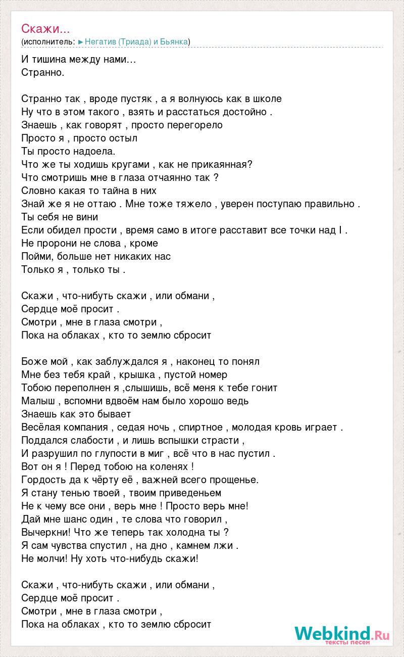 И тишина между нами… Странно. Странно так , вроде пустяк , а я волнуюсь как в школе Ну что в этом такого , взять и расстаться достойно . Знаешь , как говорят , просто перегорело Просто я , просто остыл Ты просто надоела. Что же ты ходишь кругами , как не прикаянная? Что смотришь мне в глаза отчаянно так ? Словно какая то тайна в них Знай же я не оттаю . Мне тоже тяжело , уверен поступаю правильно . Ты себя не вини Если обидел прости , время само в итоге расставит все точки над I . Не пророни не слова , кроме Пойми, больше нет никаких нас Только я , только ты . Скажи , что-нибуть скажи , или обмани , Сердце моё просит . Смотри , мне в глаза смотри , Пока на облаках , кто то землю сбросит Боже мой , как заблуждался я , наконец то понял Мне без тебя край , крышка , пустой номер Тобою переполнен я ,слышишь, всё меня к тебе гонит Малыш , вспомни вдвоём нам было хорошо ведь Знаешь как это бывает Весёлая компания , седая ночь , спиртное , молодая кровь играет . Поддался слабости , и лишь вспышки страсти , И разрушил по глупости в миг , всё что в нас пустил . Вот он я ! Перед тобою на коленях ! Гордость да к чёрту её , важней всего прощенье. Я стану тенью твоей , твоим приведеньем Не к чему все они , верь мне ! Просто верь мне! Дай мне шанс один , те слова что говорил , Вычеркни! Что же теперь так холодна ты ? Я сам чувства спустил , на дно , камнем лжи . Не молчи! Ну хоть что-нибудь скажи! Скажи , что-нибуть скажи , или обмани , Сердце моё просит . Смотри , мне в глаза смотри , Пока на облаках , кто то землю сбросит