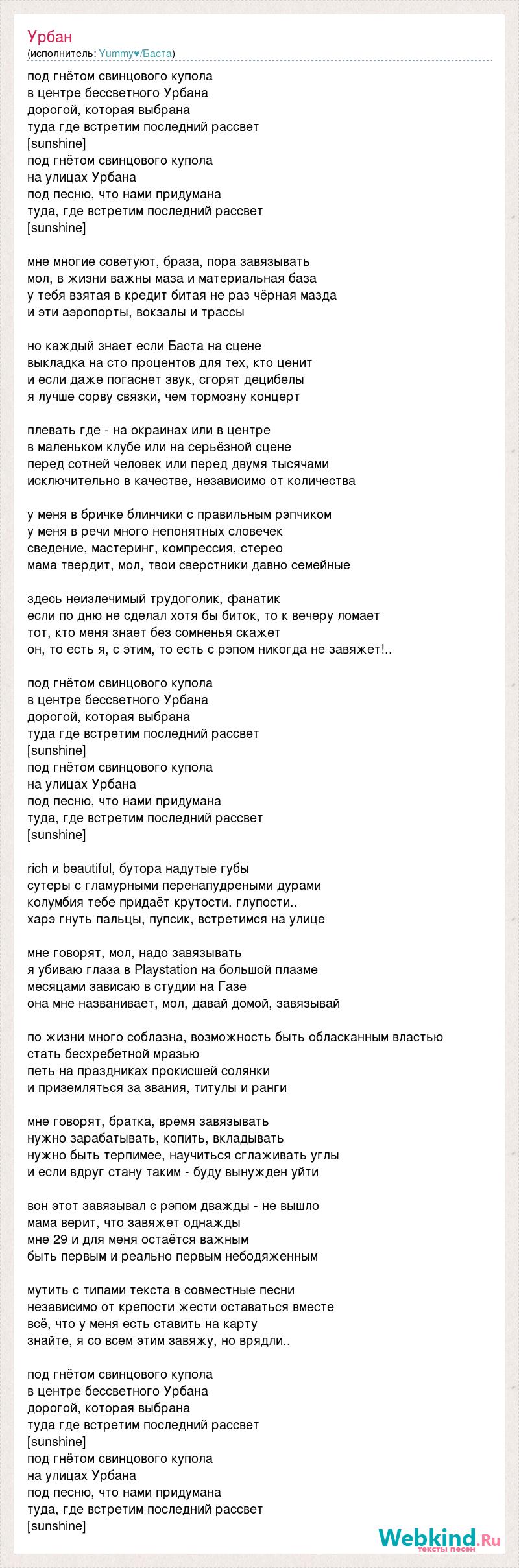 под гнётом свинцового купола в центре бессветного Урбана дорогой, которая выбрана туда где встретим последний рассвет [sunshine] под гнётом свинцового купола на улицах Урбана под песню, что нами придумана туда, где встретим последний рассвет [sunshine] мне многие советуют, браза, пора завязывать мол, в жизни важны маза и материальная база у тебя взятая в кредит битая не раз чёрная мазда и эти аэропорты, вокзалы и трассы но каждый знает если Баста на сцене выкладка на сто процентов для тех, кто ценит и если даже погаснет звук, сгорят децибелы я лучше сорву связки, чем тормозну концерт плевать где - на окраинах или в центре в маленьком клубе или на серьёзной сцене перед сотней человек или перед двумя тысячами исключительно в качестве, независимо от количества у меня в бричке блинчики с правильным рэпчиком у меня в речи много непонятных словечек сведение, мастеринг, компрессия, стерео мама твердит, мол, твои сверстники давно семейные здесь неизлечимый трудоголик, фанатик если по дню не сделал хотя бы биток, то к вечеру ломает тот, кто меня знает без сомненья скажет он, то есть я, с этим, то есть с рэпом никогда не завяжет!.. под гнётом свинцового купола в центре бессветного Урбана дорогой, которая выбрана туда где встретим последний рассвет [sunshine] под гнётом свинцового купола на улицах Урбана под песню, что нами придумана туда, где встретим последний рассвет [sunshine] rich и beautiful, бутора надутые губы сутеры с гламурными перенапудреными дурами колумбия тебе придаёт крутости. глупости.. харэ гнуть пальцы, пупсик, встретимся на улице мне говорят, мол, надо завязывать я убиваю глаза в Playstation на большой плазме месяцами зависаю в студии на Газе она мне названивает, мол, давай домой, завязывай по жизни много соблазна, возможность быть обласканным властью стать бесхребетной мразью петь на праздниках прокисшей солянки и приземляться за звания, титулы и ранги мне говорят, братка, время завязывать нужно зарабатывать, копить, вкладывать нужно быть терпимее, научиться сглаживать углы и если вдруг стану таким - буду вынужден уйти вон этот завязывал с рэпом дважды - не вышло мама верит, что завяжет однажды мне 29 и для меня остаётся важным быть первым и реально первым небодяженным мутить с типами текста в совместные песни независимо от крепости жести оставаться вместе всё, что у меня есть ставить на карту знайте, я со всем этим завяжу, но врядли.. под гнётом свинцового купола в центре бессветного Урбана дорогой, которая выбрана туда где встретим последний рассвет [sunshine] под гнётом свинцового купола на улицах Урбана под песню, что нами придумана туда, где встретим последний рассвет [sunshine]