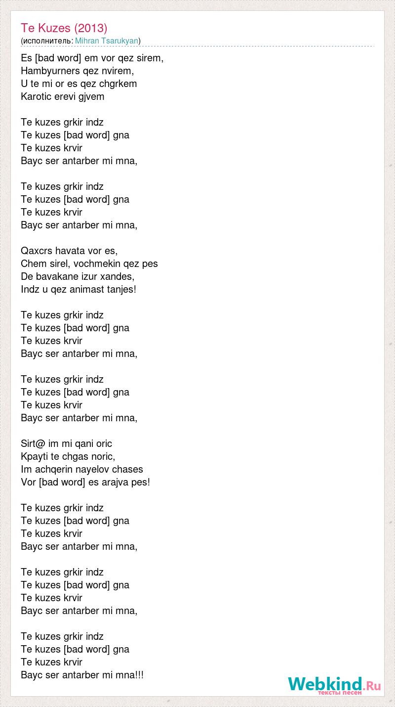 Es [bad word] em vor qez sirem, Hambyurners qez nvirem, U te mi or es qez chgrkem Karotic erevi gjvem Te kuzes grkir indz Te kuzes [bad word] gna Te kuzes krvir Bayc ser antarber mi mna, Te kuzes grkir indz Te kuzes [bad word] gna Te kuzes krvir Bayc ser antarber mi mna, Qaxcrs havata vor es, Chem sirel, vochmekin qez pes De bavakane izur xandes, Indz u qez animast tanjes! Te kuzes grkir indz Te kuzes [bad word] gna Te kuzes krvir Bayc ser antarber mi mna, Te kuzes grkir indz Te kuzes [bad word] gna Te kuzes krvir Bayc ser antarber mi mna, Sirt@ im mi qani oric Kpayti te chgas noric, Im achqerin nayelov chases Vor [bad word] es arajva pes! Te kuzes grkir indz Te kuzes [bad word] gna Te kuzes krvir Bayc ser antarber mi mna, Te kuzes grkir indz Te kuzes [bad word] gna Te kuzes krvir Bayc ser antarber mi mna, Te kuzes grkir indz Te kuzes [bad word] gna Te kuzes krvir Bayc ser antarber mi mna!!!