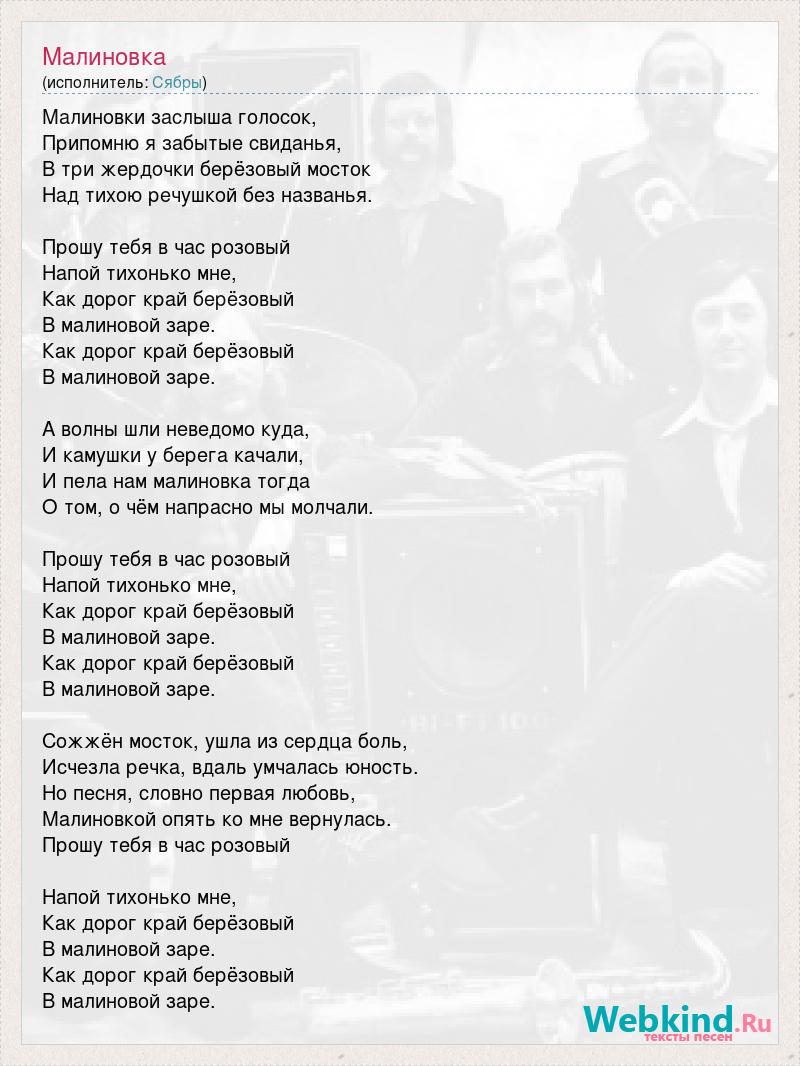Малиновки заслыша голосок, Припомню я забытые свиданья, В три жердочки берёзовый мосток Над тихою речушкой без названья. Прошу тебя в час розовый Напой тихонько мне, Как дорог край берёзовый В малиновой заре. Как дорог край берёзовый В малиновой заре. А волны шли неведомо куда, И камушки у берега качали, И пела нам малиновка тогда О том, о чём напрасно мы молчали. Прошу тебя в час розовый Напой тихонько мне, Как дорог край берёзовый В малиновой заре. Как дорог край берёзовый В малиновой заре. Сожжён мосток, ушла из сердца боль, Исчезла речка, вдаль умчалась юность. Но песня, словно первая любовь, Малиновкой опять ко мне вернулась. Прошу тебя в час розовый Напой тихонько мне, Как дорог край берёзовый В малиновой заре. Как дорог край берёзовый В малиновой заре.