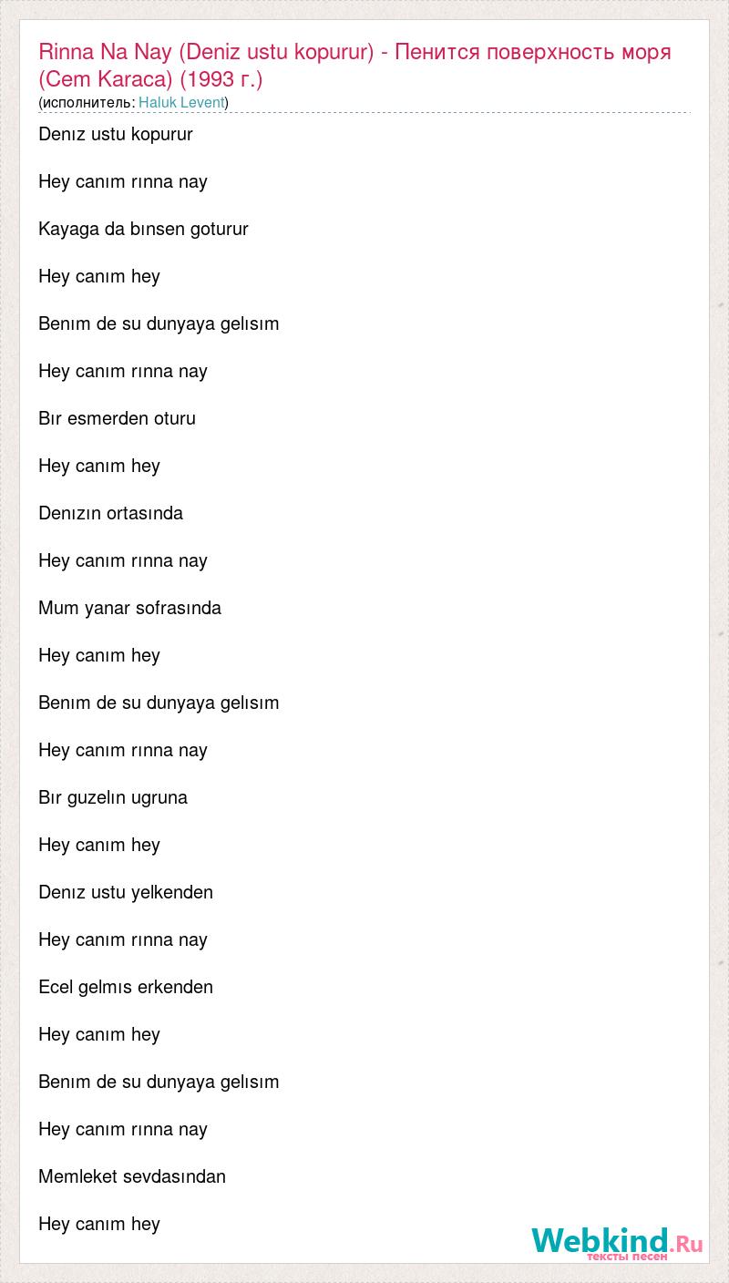 Denız ustu kopurur Hey canım rınna nay Kayaga da bınsen goturur Hey canım hey Benım de su dunyaya gelısım Hey canım rınna nay Bır esmerden oturu Hey canım hey Denızın ortasında Hey canım rınna nay Mum yanar sofrasında Hey canım hey Benım de su dunyaya gelısım Hey canım rınna nay Bır guzelın ugruna Hey canım hey Denız ustu yelkenden Hey canım rınna nay Ecel gelmıs erkenden Hey canım hey Benım de su dunyaya gelısım Hey canım rınna nay Memleket sevdasından Hey canım hey
