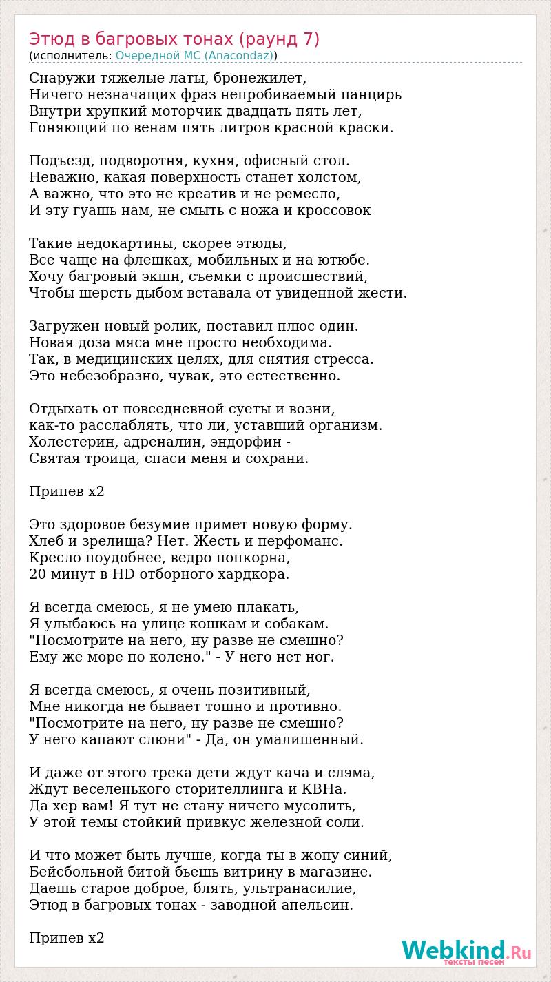 Снаружи тяжелые латы, бронежилет, Ничего незначащих фраз непробиваемый панцирь Внутри хрупкий моторчик двадцать пять лет, Гоняющий по венам пять литров красной краски. Подъезд, подворотня, кухня, офисный стол. Неважно, какая поверхность станет холстом, А важно, что это не креатив и не ремесло, И эту гуашь нам, не смыть с ножа и кроссовок Такие недокартины, скорее этюды, Все чаще на флешках, мобильных и на ютюбе. Хочу багровый экшн, съемки с происшествий, Чтобы шерсть дыбом вставала от увиденной жести. Загружен новый ролик, поставил плюс один. Новая доза мяса мне просто необходима. Так, в медицинских целях, для снятия стресса. Это небезобразно, чувак, это естественно. Отдыхать от повседневной суеты и возни, как-то расслаблять, что ли, уставший организм. Холестерин, адреналин, эндорфин - Святая троица, спаси меня и сохрани. Припев x2 Это здоровое безумие примет новую форму. Хлеб и зрелища? Нет. Жесть и перфоманс. Кресло поудобнее, ведро попкорна, 20 минут в HD отборного хардкора. Я всегда смеюсь, я не умею плакать, Я улыбаюсь на улице кошкам и собакам. "Посмотрите на него, ну разве не смешно? Ему же море по колено." - У него нет ног. Я всегда смеюсь, я очень позитивный, Мне никогда не бывает тошно и противно. "Посмотрите на него, ну разве не смешно? У него капают слюни" - Да, он умалишенный. И даже от этого трека дети ждут кача и слэма, Ждут веселенького сторителлинга и КВНа. Да хер вам! Я тут не стану ничего мусолить, У этой темы стойкий привкус железной соли. И что может быть лучше, когда ты в жопу синий, Бейсбольной битой бьешь витрину в магазине. Даешь старое доброе, блять, ультранасилие, Этюд в багровых тонах - заводной апельсин. Припев x2