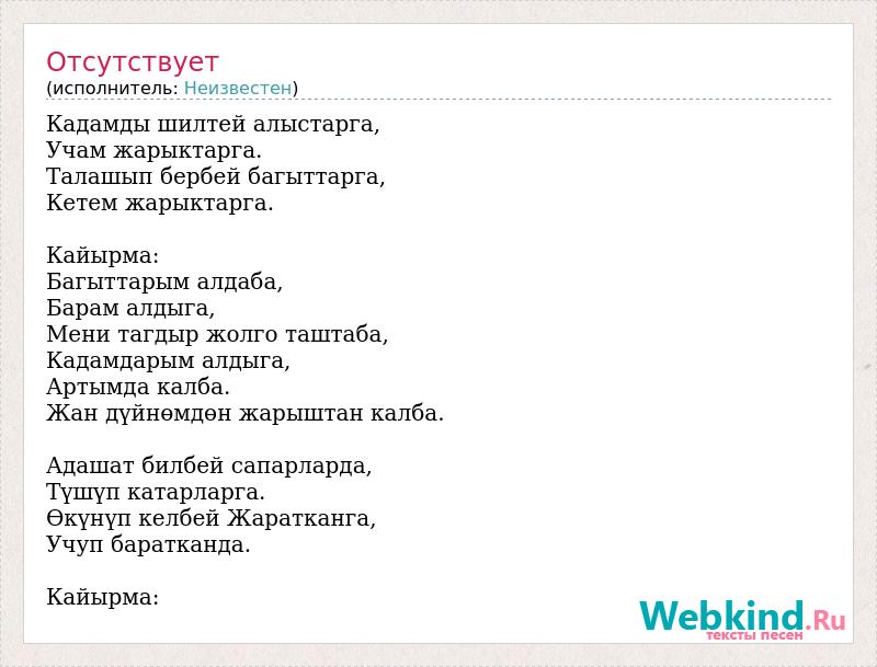 Кадамды шилтей алыстарга, Учам жарыктарга. Талашып бербей багыттарга, Кетем жарыктарга. Кайырма: Багыттарым алдаба, Барам алдыга, Мени тагдыр жолго таштаба, Кадамдарым алдыга, Артымда калба. Жан дүйнөмдөн жарыштан калба. Адашат билбей сапарларда, Түшүп катарларга. Өкүнүп келбей Жаратканга, Учуп баратканда. Кайырма: