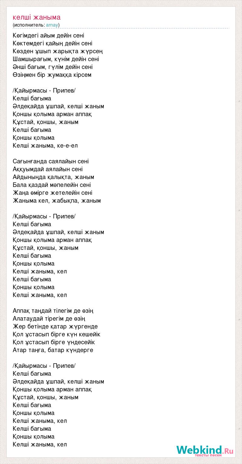 Көгімдегі айым дейін сені Көктемдегі қайың дейін сені Көзден ұшып жарықта жүрсең Шамшырағым, күнім дейін сені Әнші бағым, гүлім дейін сені Өзіңмен бір жумаққа кірсем /Қайырмасы - Припев/ Келші бағыма Әлдеқайда ұшпай, келші жаным Қоншы қолыма арман аппақ Құстай, қоншы, жаным Келші бағыма Қоншы қолыма Келші жаныма, ке-е-ел Сағынғанда саялайын сені Аққуымдай аялайын сені Айдыныңда қалықта, жаным Бала қаздай мәпелейін сені Жаңа өмірге жетелейін сені Жаныма кел, жабықпа, жаным /Қайырмасы - Припев/ Келші бағыма Әлдеқайда ұшпай, келші жаным Қоншы қолыма арман аппақ Құстай, қоншы, жаным Келші бағыма Қоншы қолыма Келші жаныма, кел Келші бағыма Қоншы қолыма Келші жаныма, кел Аппақ таңдай тілегім де өзің Алатаудай тірегім де өзің Жер бетінде қатар жүргенде Қол ұстасып бірге күн кешейік Қол ұстасып бірге үндесейік Атар таңға, батар күндерге /Қайырмасы - Припев/ Келші бағыма Әлдеқайда ұшпай, келші жаным Қоншы қолыма арман аппақ Құстай, қоншы, жаным Келші бағыма Қоншы қолыма Келші жаныма, кел Келші бағыма Қоншы қолыма Келші жаныма, кел