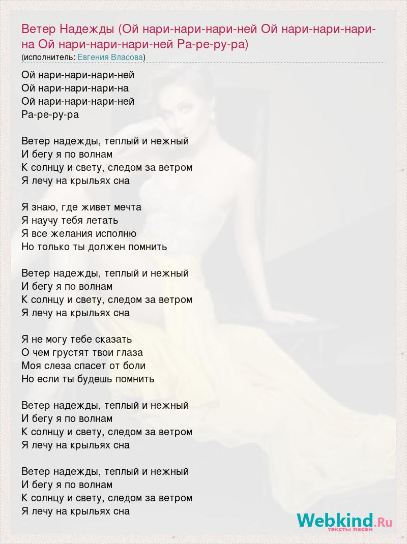 Ой нари-нари-нари-ней Ой нари-нари-нари-на Ой нари-нари-нари-ней Ра-ре-ру-ра Ветер надежды, теплый и нежный И бегу я по волнам К солнцу и свету, следом за ветром Я лечу на крыльях сна Я знаю, где живет мечта Я научу тебя летать Я все желания исполню Но только ты должен помнить Ветер надежды, теплый и нежный И бегу я по волнам К солнцу и свету, следом за ветром Я лечу на крыльях сна Я не могу тебе сказать О чем грустят твои глаза Моя слеза спасет от боли Но если ты будешь помнить Ветер надежды, теплый и нежный И бегу я по волнам К солнцу и свету, следом за ветром Я лечу на крыльях сна Ветер надежды, теплый и нежный И бегу я по волнам К солнцу и свету, следом за ветром Я лечу на крыльях сна
