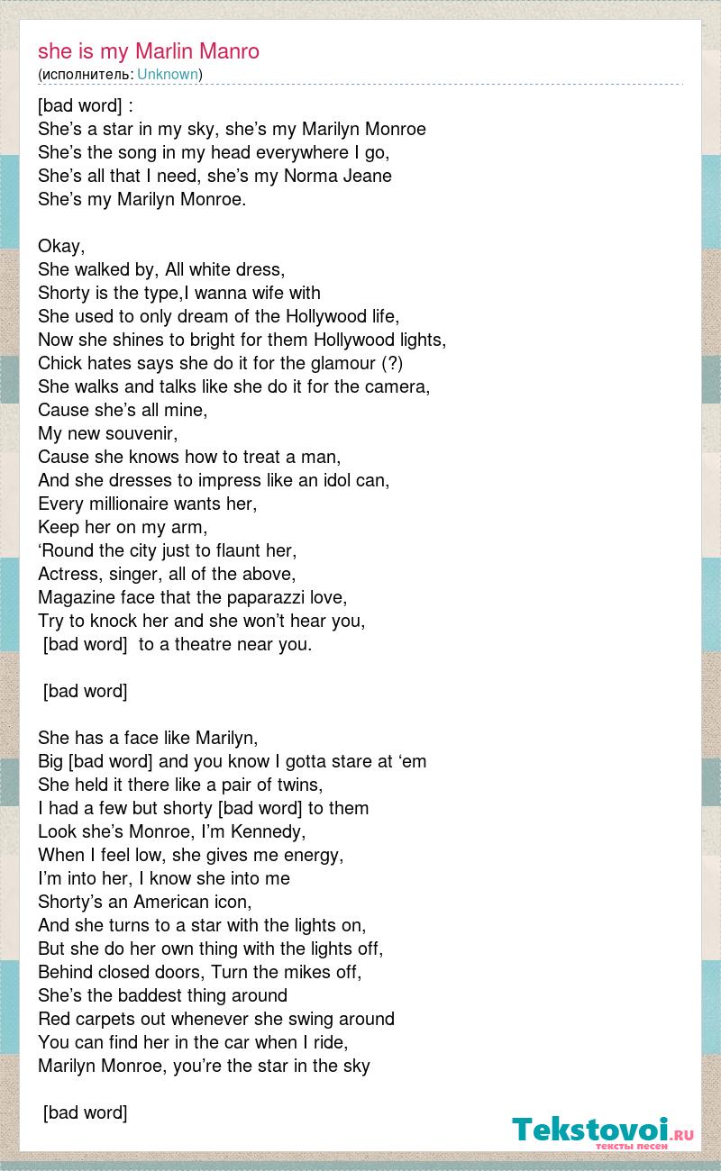 [Chorus]: She’s a star in my sky, she’s my Marilyn Monroe She’s the song in my head everywhere I go, She’s all that I need, she’s my Norma Jeane She’s my Marilyn Monroe. Okay, She walked by, All white dress, Shorty is the type,I wanna wife with She used to only dream of the Hollywood life, Now she shines to bright for them Hollywood lights, Chick hates says she do it for the glamour (?) She walks and talks like she do it for the camera, Cause she’s all mine, My new souvenir, Cause she knows how to treat a man, And she dresses to impress like an idol can, Every millionaire wants her, Keep her on my arm, ‘Round the city just to flaunt her, Actress, singer, all of the above, Magazine face that the paparazzi love, Try to knock her and she won’t hear you, She’s comin’ to a theatre near you. [Chorus] She has a face like Marilyn, Big [bad word] and you know I gotta stare at ‘em She held it there like a pair of twins, I had a few but shorty don’t compare to them Look she’s Monroe, I’m Kennedy, When I feel low, she gives me energy, I’m into her, I know she into me Shorty’s an American icon, And she turns to a star with the lights on, But she do her own thing with the lights off, Behind closed doors, Turn the mikes off, She’s the baddest thing around Red carpets out whenever she swing around You can find her in the car when I ride, Marilyn Monroe, you’re the star in the sky [Chorus]