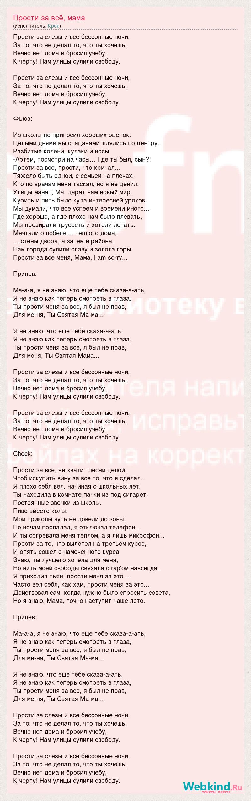 Прости за слезы и все бессонные ночи, За то, что не делал то, что ты хочешь, Вечно нет дома и бросил учебу, К черту! Нам улицы сулили свободу. Прости за слезы и все бессонные ночи, За то, что не делал то, что ты хочешь, Вечно нет дома и бросил учебу, К черту! Нам улицы сулили свободу. Фьюз: Из школы не приносил хороших оценок. Целыми днями мы спацанами шлялись по центру. Разбитые колени, кулаки и носы. -Артем, посмотри на часы... Где ты был, сын?! Прости за все, прости, что кричал... Тяжело быть одной, с семьей на плечах. Кто по врачам меня таскал, но я не ценил. Улицы манят, Ма, дарят нам новый мир. Курить и пить было куда интересней уроков. Мы думали, что все успеем и времени много... Где хорошо, а где плохо нам было плевать, Мы презирали трусость и хотели летать. Мечтали о побеге ... теплого дома, ... стены двора, а затем и района. Нам города сулили славу и золота горы. Прости за все меня, Мама, i am sorry... Припев: Ма-а-а, я не знаю, что еще тебе сказа-а-ать, Я не знаю как теперь смотреть в глаза, Ты прости меня за все, я был не прав, Для ме-ня, Ты Святая Ма-ма... Я не знаю, что еще тебе сказа-а-ать, Я не знаю как теперь смотреть в глаза, Ты прости меня за все, я был не прав, Для меня, Ты Святая Мама... Прости за слезы и все бессонные ночи, За то, что не делал то, что ты хочешь, Вечно нет дома и бросил учебу, К черту! Нам улицы сулили свободу. Прости за слезы и все бессонные ночи, За то, что не делал то, что ты хочешь, Вечно нет дома и бросил учебу, К черту! Нам улицы сулили свободу. Check: Прости за все, не хватит песни целой, Чтоб искупить вину за все то, что я сделал... Я плохо себя вел, начиная с школьных лет. Ты находила в комнате пачки из под сигарет. Постоянные звонки из школы. Пиво вместо колы. Мои приколы чуть не довели до зоны. По ночам пропадал, я отключал телефон... И ты согревала меня теплом, а я лишь микрофон... Прости за то, что вылетел на третьем курсе, И опять сошел с намеченного курса. Знаю, ты лучшего хотела для меня, Но нить моей свободы связала с rap'ом навсегда. Я приходил пьян, прости меня за это... Часто вел себя, как хам, прости меня за это... Действовал сам, когда нужно было спросить совета, Но я знаю, Мама, точно наступит наше лето. Припев: Ма-а-а, я не знаю, что еще тебе сказа-а-ать, Я не знаю как теперь смотреть в глаза, Ты прости меня за все, я был не прав, Для ме-ня, Ты Святая Ма-ма... Я не знаю, что еще тебе сказа-а-ать, Я не знаю как теперь смотреть в глаза, Ты прости меня за все, я был не прав, Для ме-ня, Ты Святая Ма-ма... Прости за слезы и все бессонные ночи, За то, что не делал то, что ты хочешь, Вечно нет дома и бросил учебу, К черту! Нам улицы сулили свободу. Прости за слезы и все бессонные ночи, За то, что не делал то, что ты хочешь, Вечно нет дома и бросил учебу, К черту! Нам улицы сулили свободу.
