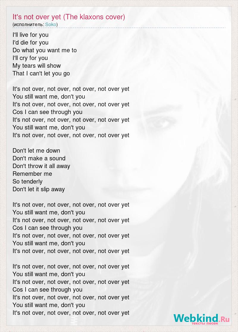 I'll live for you I'd die for you Do what you want me to I'll cry for you My tears will show That I can't let you go It's not over, not over, not over, not over yet You still want me, don't you It's not over, not over, not over, not over yet Cos I can see through you It's not over, not over, not over, not over yet You still want me, don't you It's not over, not over, not over, not over yet Don't let me down Don't make a sound Don't throw it all away Remember me So tenderly Don't let it slip away It's not over, not over, not over, not over yet You still want me, don't you It's not over, not over, not over, not over yet Cos I can see through you It's not over, not over, not over, not over yet You still want me, don't you It's not over, not over, not over, not over yet It's not over, not over, not over, not over yet You still want me, don't you It's not over, not over, not over, not over yet Cos I can see through you It's not over, not over, not over, not over yet You still want me, don't you It's not over, not over, not over, not over yet