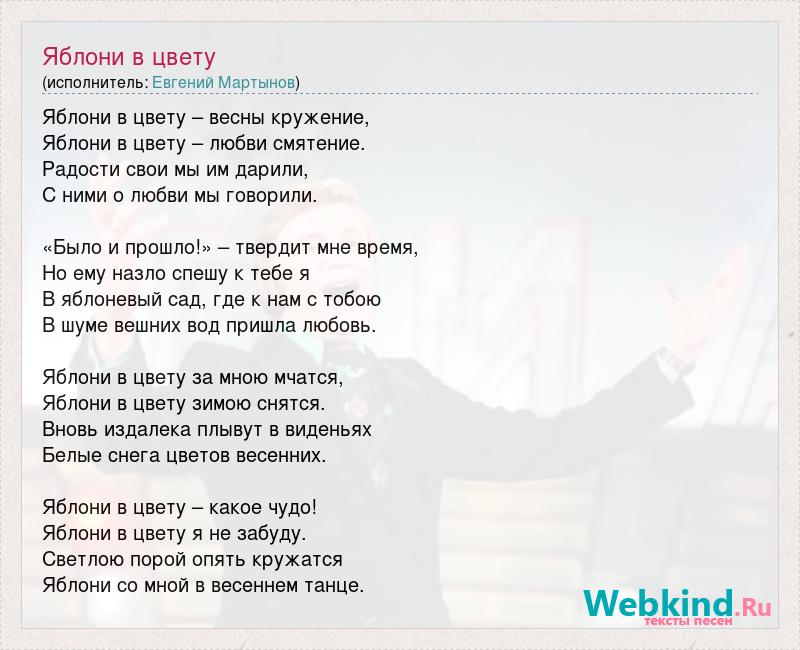 Яблони в цвету – весны кружение, Яблони в цвету – любви смятение. Радости свои мы им дарили, С ними о любви мы говорили. «Было и прошло!» – твердит мне время, Но ему назло спешу к тебе я В яблоневый сад, где к нам с тобою В шуме вешних вод пришла любовь. Яблони в цвету за мною мчатся, Яблони в цвету зимою снятся. Вновь издалека плывут в виденьях Белые снега цветов весенних. Яблони в цвету – какое чудо! Яблони в цвету я не забуду. Светлою порой опять кружатся Яблони со мной в весеннем танце.