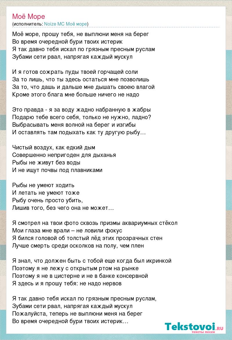 Моё море, прошу тебя, не выплюни меня на берег Во время очередной бури твоих истерик Я так давно тебя искал по грязным пресным руслам Зубами сети рвал, напрягая каждый мускул И я готов сожрать пуды твоей горчащей соли За то лишь, что ты здесь остаться мне позволишь За то, что дашь и дальше мне дышать своею влагой Кроме этого блага мне больше ничего не надо Это правда - я за воду жадно набранную в жабры Подарю тебе всего себя, только не нужно, ладно? Выбрасывать меня волной на берег и изгибы И оставлять там подыхать как ту другую рыбу… Чистый воздух, как едкий дым Совершенно непригоден для дыханья Рыбы не живут без воды И не ищут почвы под плавниками Рыбы не умеют ходить И летать не умеют тоже Рыбу очень просто убить, Лишив того, без чего она не может… Я смотрел на твои фото сквозь призмы аквариумных стёкол Мои глаза мне врали – не ловили фокус Я бился головой об толстый лёд этих прозрачных стен Лучше смерть среди осколков на полу, чем плен Я знал, что должен быть с тобой еще когда был икринкой Поэтому я не лежу с открытым ртом на рынке Поэтому я не в цистерне и не в банке консервной Я здесь и я прошу тебя: не надо нервов Я так давно тебя искал по грязным пресным руслам, Зубами сети рвал, напрягая каждый мускул Пожалуйста, теперь не выплюни меня на берег Во время очередной бури твоих истерик…