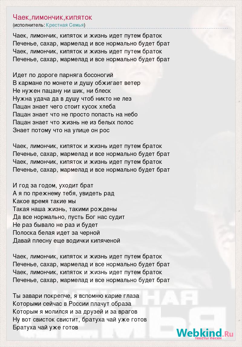 Чаек, лимончик, кипяток и жизнь идет путем браток Печенье, сахар, мармелад и все нормально будет брат Чаек, лимончик, кипяток и жизнь идет путем браток Печенье, сахар, мармелад и все нормально будет брат Идет по дороге парняга босоногий В кармане по монете и душу обжигает ветер Не нужен пацану ни шик, ни блеск Нужна удача да в душу чтоб никто не лез Пацан знает чего стоит кусок хлеба Пацан знает что не просто попасть на небо Пацан знает что жизнь не из белых полос Знает потому что на улице он рос Чаек, лимончик, кипяток и жизнь идет путем браток Печенье, сахар, мармелад и все нормально будет брат Чаек, лимончик, кипяток и жизнь идет путем браток Печенье, сахар, мармелад и все нормально будет брат И год за годом, уходит брат А я по прежнему тебя, увидеть рад Какое время такие мы Такая наша жизнь, такими рождены Да все нормально, пусть Бог нас судит Не раз бывало не раз и будет Полоска белая идет за черной Давай плесну еще водички кипяченой Чаек, лимончик, кипяток и жизнь идет путем браток Печенье, сахар, мармелад и все нормально будет брат Чаек, лимончик, кипяток и жизнь идет путем браток Печенье, сахар, мармелад и все нормально будет брат Ты завари покрепче, я вспомню карие глаза Которыми сейчас в России плачут образа Которым я молился и за друзей и за врагов Ну вот свисток свистит, братуха чай уже готов Братуха чай уже готов
