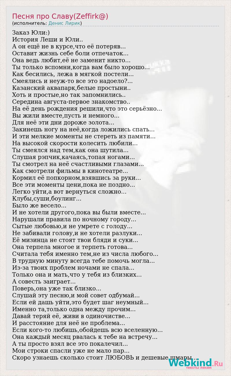 Заказ Юли:) История Леши и Юли.. А он ещё не в курсе,что её потеряв... Оставит жизнь себе боли отпечаток... Она ведь любит,её не заменит никто... Ты только вспомни,когда вам было хорошо... Как бесились, лежа в мягкой постели... Смеялись и неуж-то все это надоело?... Казанский аквапарк,белые простыни.. Хоть и простые,но так запомнились.. Середина августа-первое знакомство.. На её день рождения решили,что это серьёзно... Вы жили вместе,пусть и немного... Для неё эти дни дороже золота... Закинешь ногу на неё,когда ложились спать... И эти мелкие моменты не стереть из памяти... На высокой скорости колесить любили... Ты смеялся над тем,как она шутила... Слушая рэпчик,качаясь,топая ногами... Ты смотрел на неё счастливыми глазами... Как смотрели фильмы в кинотеатре... Кормил её попкорном,взявшись за руки... Все эти моменты цени,пока не поздно... Легко уйти,а вот вернуться сложно... Клубы,суши,боулинг... Было же весело... И не хотели другого,пока вы были вместе... Нарушали правила по ночному городу... Сытые любовью,и не умрете с голоду... Не забивали голову,и не хотели разлуки... Её мизинца не стоят твои бляди и суки... Она терпела многое и терпеть готова... Считала тебя именно тем,не из числа любого... В трудную минуту всегда тебе помочь могла... Из-за твоих проблем ночами не спала... Только она и мать,что у тебя из близких... А совесть заиграет... Поверь,она уже так близко... Слушай эту песню,и мой совет одбумай... Если ей дашь уйти,это будет шаг неумный... Именно та,только одна между прочим... Давай теряй её, живи в одиночистве... И расстояние для неё не проблема... Если кого-то любишь,обойдешь всю вселенную... Она каждый месяц рвалась к тебе на встречу... А ты просто взял все это покалечил... Мои строки спасли уже не мало пар... Скоро узнаешь сколько стоит ЛЮБОВЬ и дешевые шмары...