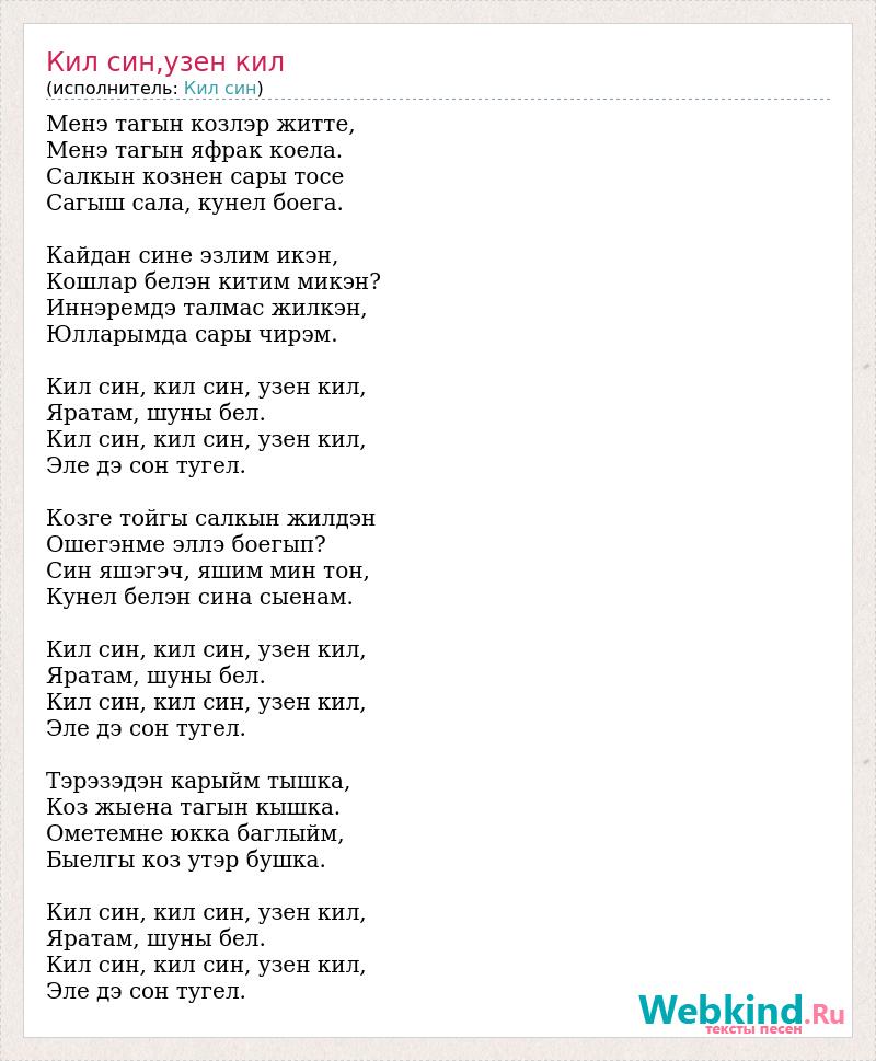 Менэ тагын козлэр житте, Менэ тагын яфрак коела. Салкын кознен сары тосе Сагыш сала, кунел боега. Кайдан сине эзлим икэн, Кошлар белэн китим микэн? Иннэремдэ талмас жилкэн, Юлларымда сары чирэм. Кил син, кил син, узен кил, Яратам, шуны бел. Кил син, кил син, узен кил, Эле дэ сон тугел. Козге тойгы салкын жилдэн Ошегэнме эллэ боегып? Син яшэгэч, яшим мин тон, Кунел белэн сина сыенам. Кил син, кил син, узен кил, Яратам, шуны бел. Кил син, кил син, узен кил, Эле дэ сон тугел. Тэрэзэдэн карыйм тышка, Коз жыена тагын кышка. Ометемне юкка баглыйм, Быелгы коз утэр бушка. Кил син, кил син, узен кил, Яратам, шуны бел. Кил син, кил син, узен кил, Эле дэ сон тугел.