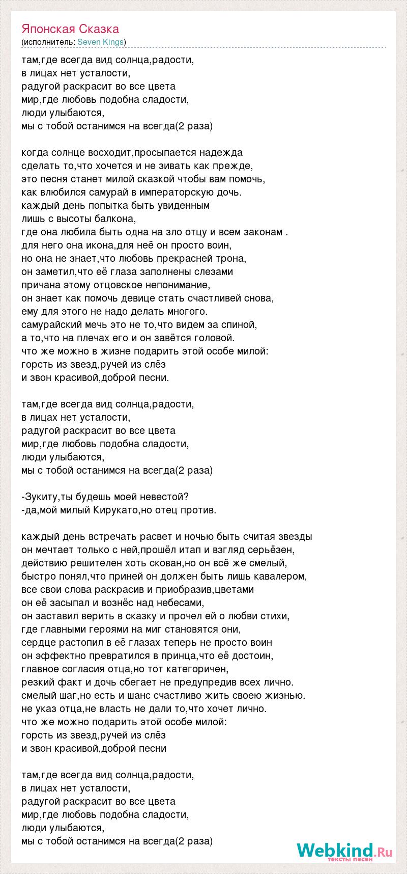 там,где всегда вид солнца,радости, в лицах нет усталости, радугой раскрасит во все цвета мир,где любовь подобна сладости, люди улыбаются, мы с тобой останимся на всегда(2 раза) когда солнце восходит,просыпается надежда сделать то,что хочется и не зивать как прежде, это песня станет милой сказкой чтобы вам помочь, как влюбился самурай в императорскую дочь. каждый день попытка быть увиденным лишь с высоты балкона, где она любила быть одна на зло отцу и всем законам . для него она икона,для неё он просто воин, но она не знает,что любовь прекрасней трона, он заметил,что её глаза заполнены слезами причана этому отцовское непонимание, он знает как помочь девице стать счастливей снова, ему для этого не надо делать многого. самурайский мечь это не то,что видем за спиной, а то,что на плечах его и он завётся головой. что же можно в жизне подарить этой особе милой: горсть из звезд,ручей из слёз и звон красивой,доброй песни. там,где всегда вид солнца,радости, в лицах нет усталости, радугой раскрасит во все цвета мир,где любовь подобна сладости, люди улыбаются, мы с тобой останимся на всегда(2 раза) -Зукиту,ты будешь моей невестой? -да,мой милый Кирукато,но отец против. каждый день встречать расвет и ночью быть считая звезды он мечтает только с ней,прошёл итап и взгляд серьёзен, действию решителен хоть скован,но он всё же смелый, быстро понял,что приней он должен быть лишь кавалером, все свои слова раскрасив и приобразив,цветами он её засыпал и вознёс над небесами, он заставил верить в сказку и прочел ей о любви стихи, где главными героями на миг становятся они, сердце растопил в её глазах теперь не просто воин он эффектно превратился в принца,что её достоин, главное согласия отца,но тот категоричен, резкий факт и дочь сбегает не предупредив всех лично. смелый шаг,но есть и шанс счастливо жить своею жизнью. не указ отца,не власть не дали то,что хочет лично. что же можно подарить этой особе милой: горсть из звезд,ручей из слёз и звон красивой,доброй песни там,где всегда вид солнца,радости, в лицах нет усталости, радугой раскрасит во все цвета мир,где любовь подобна сладости, люди улыбаются, мы с тобой останимся на всегда(2 раза)