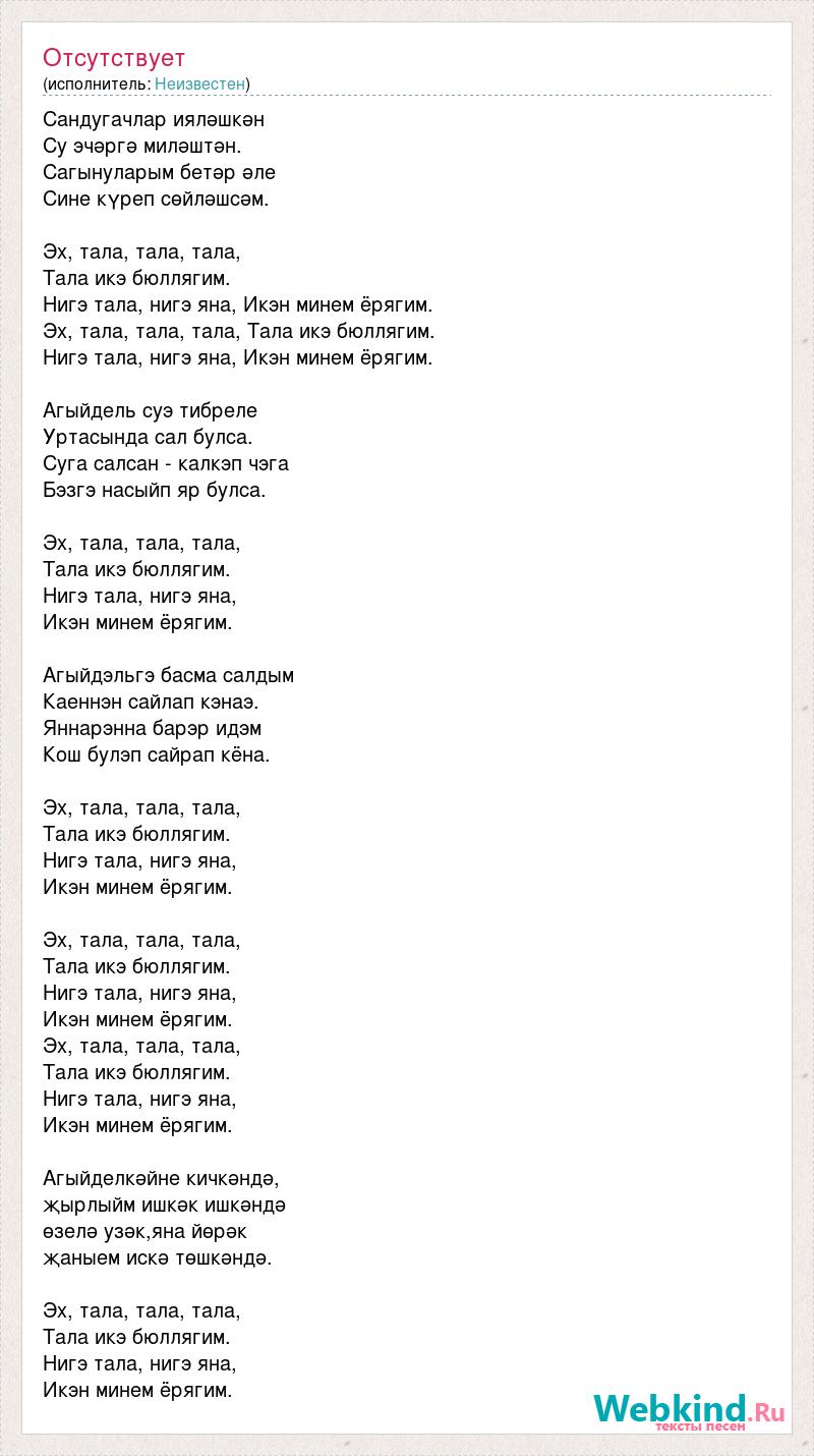 Сандугачлар ияләшкән Су эчәргә миләштән. Сагынуларым бетәр әле Сине күреп сөйләшсәм. Эх, тала, тала, тала, Тала икэ бюллягим. Нигэ тала, нигэ яна, Икэн минем ёрягим. Эх, тала, тала, тала, Тала икэ бюллягим. Нигэ тала, нигэ яна, Икэн минем ёрягим. Агыйдель суэ тибреле Уртасында сал булса. Суга салсан - калкэп чэга Бэзгэ насыйп яр булса. Эх, тала, тала, тала, Тала икэ бюллягим. Нигэ тала, нигэ яна, Икэн минем ёрягим. Агыйдэльгэ басма салдым Каеннэн сайлап кэнаэ. Яннарэнна барэр идэм Кош булэп сайрап кёна. Эх, тала, тала, тала, Тала икэ бюллягим. Нигэ тала, нигэ яна, Икэн минем ёрягим. Эх, тала, тала, тала, Тала икэ бюллягим. Нигэ тала, нигэ яна, Икэн минем ёрягим. Эх, тала, тала, тала, Тала икэ бюллягим. Нигэ тала, нигэ яна, Икэн минем ёрягим. Агыйделкәйне кичкәндә, җырлыйм ишкәк ишкәндә өзелә узәк,яна йөрәк җаныем искә төшкәндә. Эх, тала, тала, тала, Тала икэ бюллягим. Нигэ тала, нигэ яна, Икэн минем ёрягим.