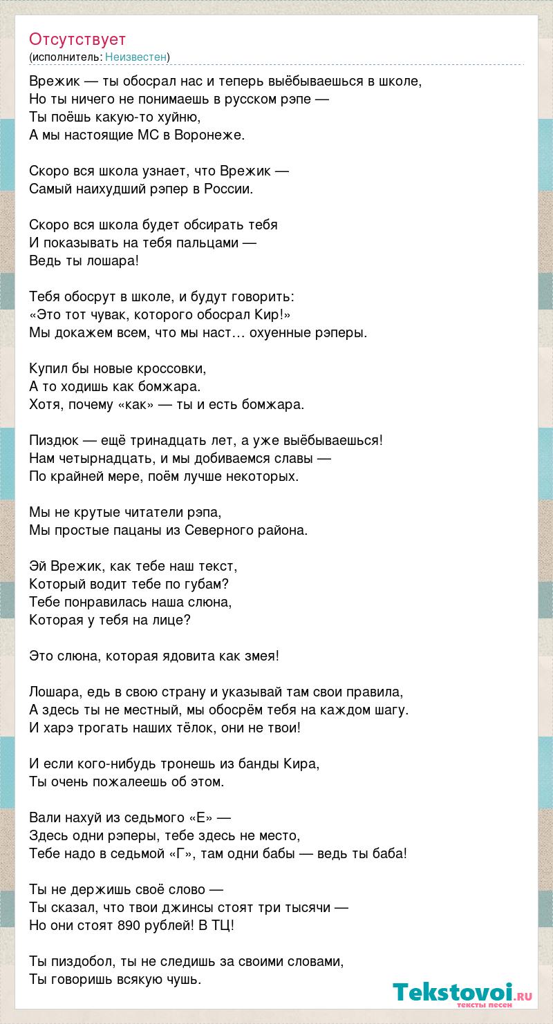 Врежик — ты обосрал нас и теперь выёбываешься в школе, Но ты ничего не понимаешь в русском рэпе — Ты поёшь какую-то хуйню, А мы настоящие MC в Воронеже. Скоро вся школа узнает, что Врежик — Самый наихудший рэпер в России. Скоро вся школа будет обсирать тебя И показывать на тебя пальцами — Ведь ты лошара! Тебя обосрут в школе, и будут говорить: «Это тот чувак, которого обосрал Кир!» Мы докажем всем, что мы наст… охуенные рэперы. Купил бы новые кроссовки, А то ходишь как бомжара. Хотя, почему «как» — ты и есть бомжара. Пиздюк — ещё тринадцать лет, а уже выёбываешься! Нам четырнадцать, и мы добиваемся славы — По крайней мере, поём лучше некоторых. Мы не крутые читатели рэпа, Мы простые пацаны из Северного района. Эй Врежик, как тебе наш текст, Который водит тебе по губам? Тебе понравилась наша слюна, Которая у тебя на лице? Это слюна, которая ядовита как змея! Лошара, едь в свою страну и указывай там свои правила, А здесь ты не местный, мы обосрём тебя на каждом шагу. И харэ трогать наших тёлок, они не твои! И если кого-нибудь тронешь из банды Кира, Ты очень пожалеешь об этом. Вали нахуй из седьмого «Е» — Здесь одни рэперы, тебе здесь не место, Тебе надо в седьмой «Г», там одни бабы — ведь ты баба! Ты не держишь своё слово — Ты сказал, что твои джинсы стоят три тысячи — Но они стоят 890 рублей! В ТЦ! Ты пиздобол, ты не следишь за своими словами, Ты говоришь всякую чушь.