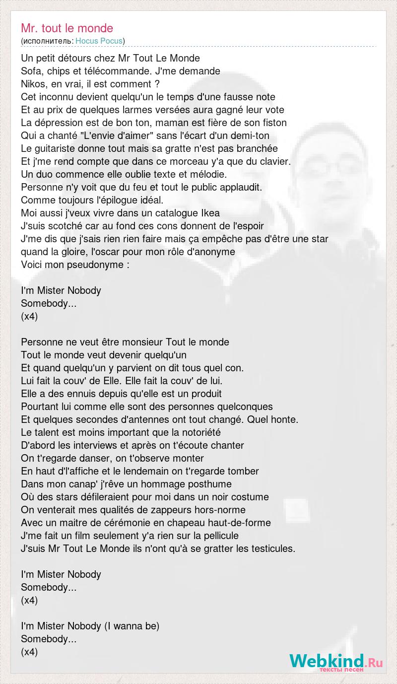 Un petit détours chez Mr Tout Le Monde Sofa, chips et télécommande. J'me demande Nikos, en vrai, il est comment ? Cet inconnu devient quelqu'un le temps d'une fausse note Et au prix de quelques larmes versées aura gagné leur vote La dépression est de bon ton, maman est fière de son fiston Qui a chanté "L'envie d'aimer" sans l'écart d'un demi-ton Le guitariste donne tout mais sa gratte n'est pas branchée Et j'me rend compte que dans ce morceau y'a que du clavier. Un duo commence elle oublie texte et mélodie. Personne n'y voit que du feu et tout le public applaudit. Comme toujours l'épilogue idéal. Moi aussi j'veux vivre dans un catalogue Ikea J'suis scotché car au fond ces cons donnent de l'espoir J'me dis que j'sais rien rien faire mais ça empêche pas d'être une star quand la gloire, l'oscar pour mon rôle d'anonyme Voici mon pseudonyme : I'm Mister Nobody Somebody... (x4) Personne ne veut être monsieur Tout le monde Tout le monde veut devenir quelqu'un Et quand quelqu'un y parvient on dit tous quel con. Lui fait la couv' de Elle. Elle fait la couv' de lui. Elle a des ennuis depuis qu'elle est un produit Pourtant lui comme elle sont des personnes quelconques Et quelques secondes d'antennes ont tout changé. Quel honte. Le talent est moins important que la notoriété D'abord les interviews et après on t'écoute chanter On t'regarde danser, on t'observe monter En haut d'l'affiche et le lendemain on t'regarde tomber Dans mon canap' j'rêve un hommage posthume Où des stars défileraient pour moi dans un noir costume On venterait mes qualités de zappeurs hors-norme Avec un maitre de cérémonie en chapeau haut-de-forme J'me fait un film seulement y'a rien sur la pellicule J'suis Mr Tout Le Monde ils n'ont qu'à se gratter les testicules. I'm Mister Nobody Somebody... (x4) I'm Mister Nobody (I wanna be) Somebody... (x4)