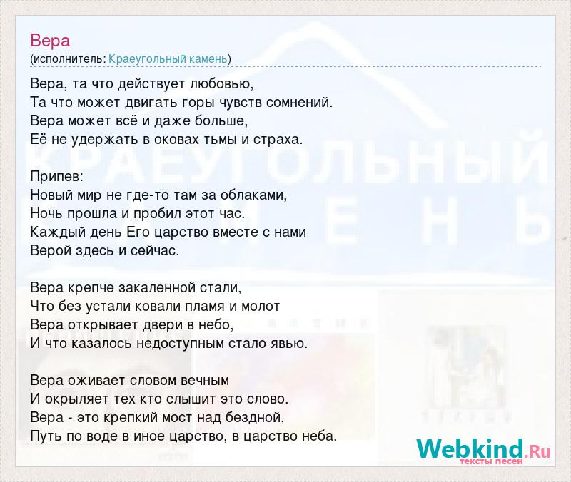 Вера, та что действует любовью, Та что может двигать горы чувств сомнений. Вера может всё и даже больше, Её не удержать в оковах тьмы и страха. Припев: Новый мир не где-то там за облаками, Ночь прошла и пробил этот час. Каждый день Его царство вместе с нами Верой здесь и сейчас. Вера крепче закаленной стали, Что без устали ковали пламя и молот Вера открывает двери в небо, И что казалось недоступным стало явью. Вера оживает словом вечным И окрыляет тех кто слышит это слово. Вера - это крепкий мост над бездной, Путь по воде в иное царство, в царство неба.