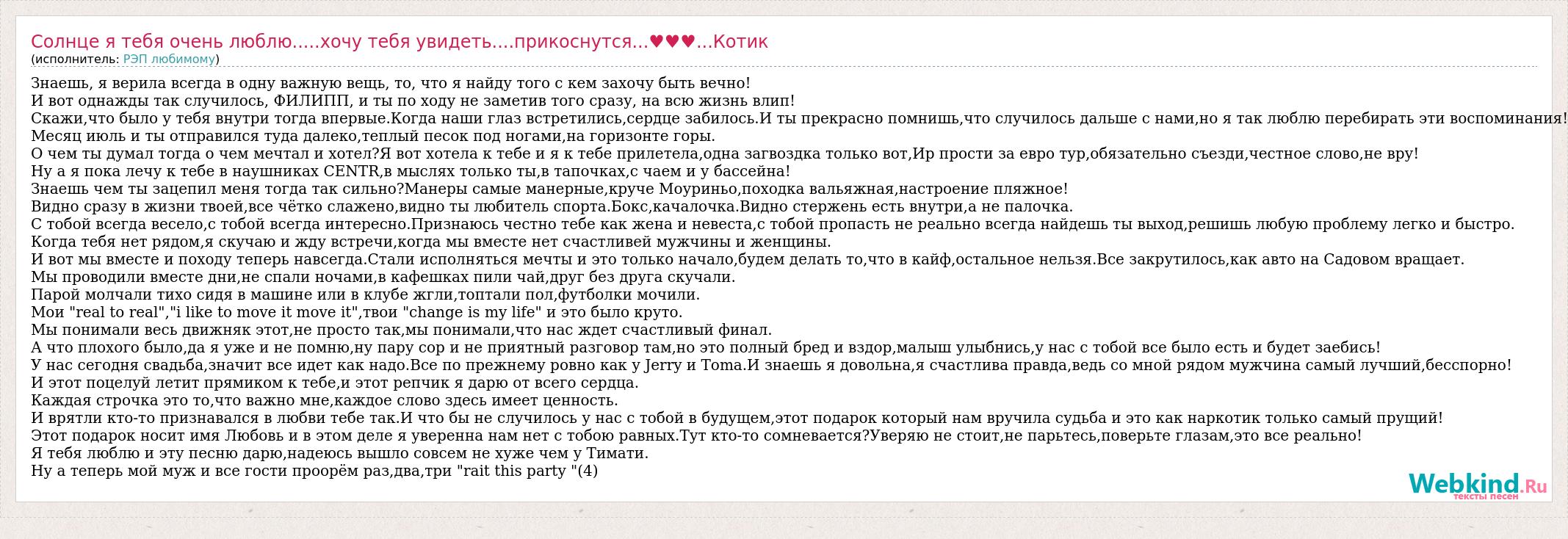Знаешь, я верила всегда в одну важную вещь, то, что я найду того с кем захочу быть вечно! И вот однажды так случилось, ФИЛИПП, и ты по ходу не заметив того сразу, на всю жизнь влип! Скажи,что было у тебя внутри тогда впервые.Когда наши глаз встретились,сердце забилось.И ты прекрасно помнишь,что случилось дальше с нами,но я так люблю перебирать эти воспоминания! Месяц июль и ты отправился туда далеко,теплый песок под ногами,на горизонте горы. О чем ты думал тогда о чем мечтал и хотел?Я вот хотела к тебе и я к тебе прилетела,одна загвоздка только вот,Ир прости за евро тур,обязательно съезди,честное слово,не вру! Ну а я пока лечу к тебе в наушниках CENTR,в мыслях только ты,в тапочках,с чаем и у бассейна! Знаешь чем ты зацепил меня тогда так сильно?Манеры самые манерные,круче Моуриньо,походка вальяжная,настроение пляжное! Видно сразу в жизни твоей,все чётко слажено,видно ты любитель спорта.Бокс,качалочка.Видно стержень есть внутри,а не палочка. С тобой всегда весело,с тобой всегда интересно.Признаюсь честно тебе как жена и невеста,с тобой пропасть не реально всегда найдешь ты выход,решишь любую проблему легко и быстро. Когда тебя нет рядом,я скучаю и жду встречи,когда мы вместе нет счастливей мужчины и женщины. И вот мы вместе и походу теперь навсегда.Стали исполняться мечты и это только начало,будем делать то,что в кайф,остальное нельзя.Все закрутилось,как авто на Садовом вращает. Мы проводили вместе дни,не спали ночами,в кафешках пили чай,друг без друга скучали. Парой молчали тихо сидя в машине или в клубе жгли,топтали пол,футболки мочили. Мои "real to real","i like to move it move it",твои "change is my life" и это было круто. Мы понимали весь движняк этот,не просто так,мы понимали,что нас ждет счастливый финал. А что плохого было,да я уже и не помню,ну пару сор и не приятный разговор там,но это полный бред и вздор,малыш улыбнись,у нас с тобой все было есть и будет заебись! У нас сегодня свадьба,значит все идет как надо.Все по прежнему ровно как у Jerry и Toma.И знаешь я довольна,я счастлива правда,ведь со мной рядом мужчина самый лучший,бесспорно! И этот поцелуй летит прямиком к тебе,и этот репчик я дарю от всего сердца. Каждая строчка это то,что важно мне,каждое слово здесь имеет ценность. И врятли кто-то признавался в любви тебе так.И что бы не случилось у нас с тобой в будущем,этот подарок который нам вручила судьба и это как наркотик только самый прущий! Этот подарок носит имя Любовь и в этом деле я уверенна нам нет с тобою равных.Тут кто-то сомневается?Уверяю не стоит,не парьтесь,поверьте глазам,это все реально! Я тебя люблю и эту песню дарю,надеюсь вышло совсем не хуже чем у Тимати. Ну а теперь мой муж и все гости проорём раз,два,три "rait this party "(4)
