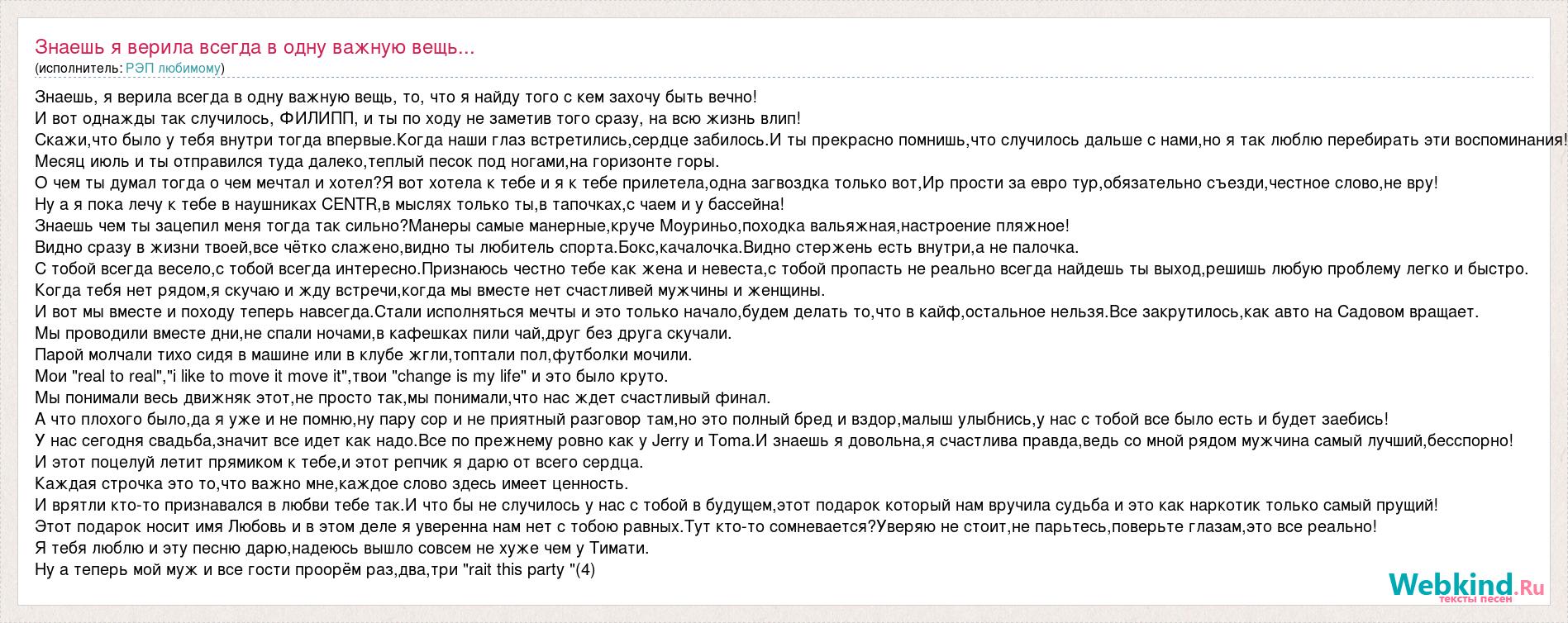 Знаешь, я верила всегда в одну важную вещь, то, что я найду того с кем захочу быть вечно! И вот однажды так случилось, ФИЛИПП, и ты по ходу не заметив того сразу, на всю жизнь влип! Скажи,что было у тебя внутри тогда впервые.Когда наши глаз встретились,сердце забилось.И ты прекрасно помнишь,что случилось дальше с нами,но я так люблю перебирать эти воспоминания! Месяц июль и ты отправился туда далеко,теплый песок под ногами,на горизонте горы. О чем ты думал тогда о чем мечтал и хотел?Я вот хотела к тебе и я к тебе прилетела,одна загвоздка только вот,Ир прости за евро тур,обязательно съезди,честное слово,не вру! Ну а я пока лечу к тебе в наушниках CENTR,в мыслях только ты,в тапочках,с чаем и у бассейна! Знаешь чем ты зацепил меня тогда так сильно?Манеры самые манерные,круче Моуриньо,походка вальяжная,настроение пляжное! Видно сразу в жизни твоей,все чётко слажено,видно ты любитель спорта.Бокс,качалочка.Видно стержень есть внутри,а не палочка. С тобой всегда весело,с тобой всегда интересно.Признаюсь честно тебе как жена и невеста,с тобой пропасть не реально всегда найдешь ты выход,решишь любую проблему легко и быстро. Когда тебя нет рядом,я скучаю и жду встречи,когда мы вместе нет счастливей мужчины и женщины. И вот мы вместе и походу теперь навсегда.Стали исполняться мечты и это только начало,будем делать то,что в кайф,остальное нельзя.Все закрутилось,как авто на Садовом вращает. Мы проводили вместе дни,не спали ночами,в кафешках пили чай,друг без друга скучали. Парой молчали тихо сидя в машине или в клубе жгли,топтали пол,футболки мочили. Мои "real to real","i like to move it move it",твои "change is my life" и это было круто. Мы понимали весь движняк этот,не просто так,мы понимали,что нас ждет счастливый финал. А что плохого было,да я уже и не помню,ну пару сор и не приятный разговор там,но это полный бред и вздор,малыш улыбнись,у нас с тобой все было есть и будет заебись! У нас сегодня свадьба,значит все идет как надо.Все по прежнему ровно как у Jerry и Toma.И знаешь я довольна,я счастлива правда,ведь со мной рядом мужчина самый лучший,бесспорно! И этот поцелуй летит прямиком к тебе,и этот репчик я дарю от всего сердца. Каждая строчка это то,что важно мне,каждое слово здесь имеет ценность. И врятли кто-то признавался в любви тебе так.И что бы не случилось у нас с тобой в будущем,этот подарок который нам вручила судьба и это как наркотик только самый прущий! Этот подарок носит имя Любовь и в этом деле я уверенна нам нет с тобою равных.Тут кто-то сомневается?Уверяю не стоит,не парьтесь,поверьте глазам,это все реально! Я тебя люблю и эту песню дарю,надеюсь вышло совсем не хуже чем у Тимати. Ну а теперь мой муж и все гости проорём раз,два,три "rait this party "(4)
