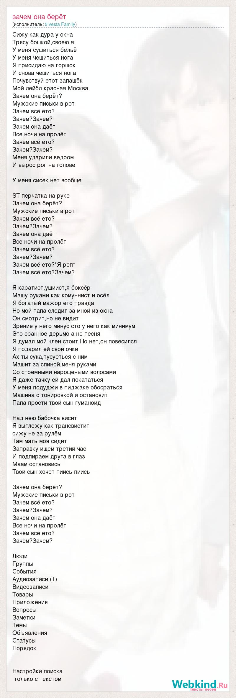 Сижу как дура у окна Трясу бошкой,своею я У меня сушиться бельё У меня чешиться нога Я присидаю на горшок И снова чешиться нога Почувствуй етот запашёк Мой лейбл красная Москва Зачем она берёт? Мужские письки в рот Зачем всё ето? Зачем?Зачем? Зачем она даёт Все ночи на пролёт Зачем всё ето? Зачем?Зачем? Меня ударили ведром И вырос рог на голове У меня сисек нет вообще ST перчатка на руке Зачем она берёт? Мужские письки в рот Зачем всё ето? Зачем?Зачем? Зачем она даёт Все ночи на пролёт Зачем всё ето? Зачем?Зачем? Зачем всё ето?*Я реп* Зачем всё ето?Зачем? Я каратист,ушиист,я боксёр Машу руками как комуннист и осёл Я богатый мажор ето правда Но мой папа следит за мной из окна Он смотрит,но не видит Зрение у него минус сто у него как минимум Это сранное дерьмо а не песня Я думал мой член стоит,Но нет,он повесился Я подарил ей свои очки Ах ты сука,тусуеться с ним Машит за спиной,меня руками Со стрёмными нарощеными волосами Я даже тачку ей дал покататься У меня подуджи в пиджаке обосраться Машина с тонировкой и остановит Папа прости твой сын гуманоид Над нею бабочка висит Я выглежу как трансвистит сижу не за рулём Там мать моя сидит Заправку ищем третий час И подпираем друга в глаз Маам остановись Твой сын хочет пиись пиись Зачем она берёт? Мужские письки в рот Зачем всё ето? Зачем?Зачем? Зачем она даёт Все ночи на пролёт Зачем всё ето? Зачем?Зачем? Люди Группы События Аудиозаписи (1) Видеозаписи Товары Приложения Вопросы Заметки Темы Объявления Статусы Порядок Настройки поиска только с текстом