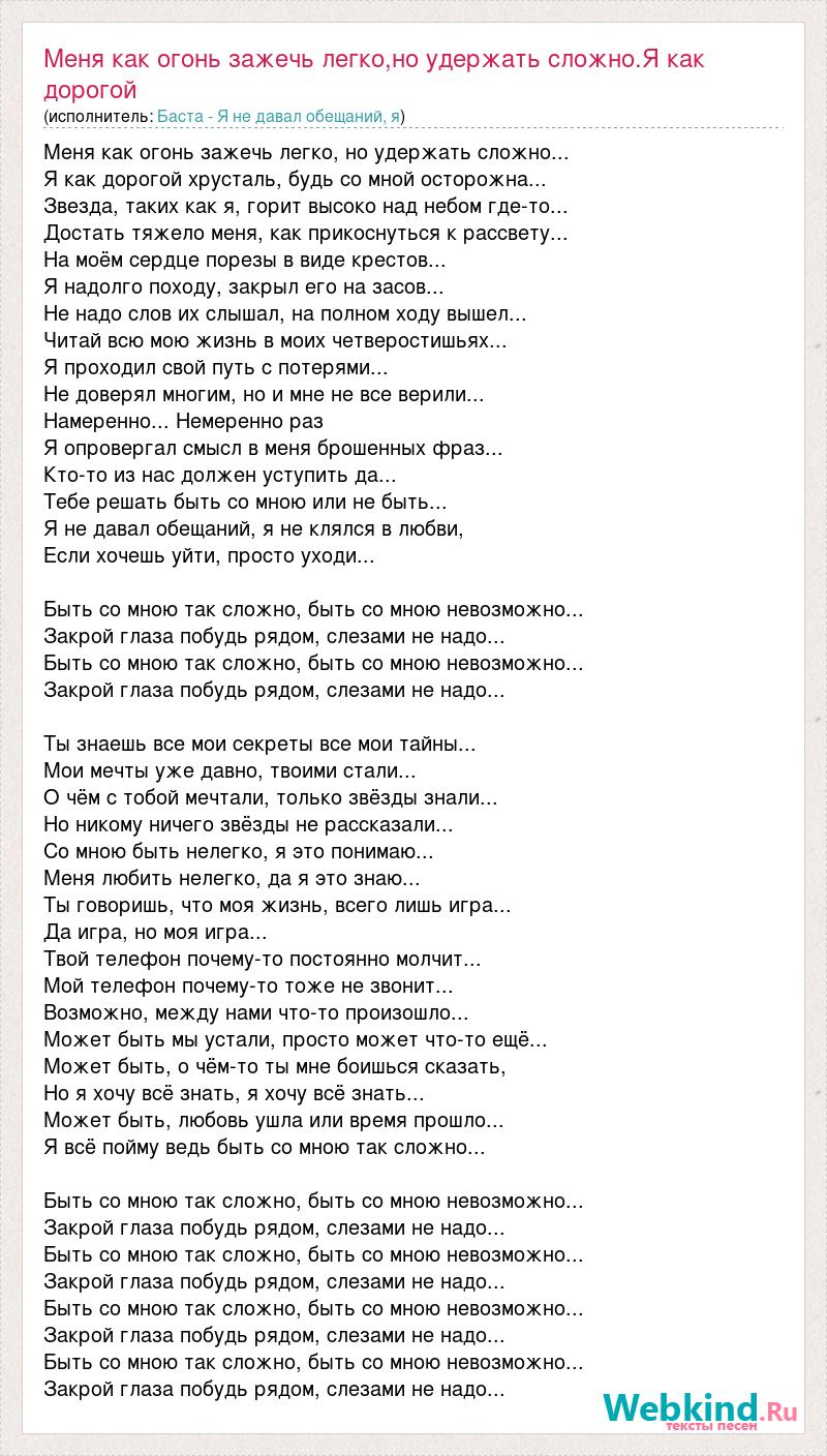 Меня как огонь зажечь легко, но удержать сложно... Я как дорогой хрусталь, будь со мной осторожна... Звезда, таких как я, горит высоко над небом где-то... Достать тяжело меня, как прикоснуться к рассвету... На моём сердце порезы в виде крестов... Я надолго походу, закрыл его на засов... Не надо слов их слышал, на полном ходу вышел... Читай всю мою жизнь в моих четверостишьях... Я проходил свой путь с потерями... Не доверял многим, но и мне не все верили... Намеренно... Немеренно раз Я опровергал смысл в меня брошенных фраз... Кто-то из нас должен уступить да... Тебе решать быть со мною или не быть... Я не давал обещаний, я не клялся в любви, Если хочешь уйти, просто уходи... Быть со мною так сложно, быть со мною невозможно... Закрой глаза побудь рядом, слезами не надо... Быть со мною так сложно, быть со мною невозможно... Закрой глаза побудь рядом, слезами не надо... Ты знаешь все мои секреты все мои тайны... Мои мечты уже давно, твоими стали... О чём с тобой мечтали, только звёзды знали... Но никому ничего звёзды не рассказали... Со мною быть нелегко, я это понимаю... Меня любить нелегко, да я это знаю... Ты говоришь, что моя жизнь, всего лишь игра... Да игра, но моя игра... Твой телефон почему-то постоянно молчит... Мой телефон почему-то тоже не звонит... Возможно, между нами что-то произошло... Может быть мы устали, просто может что-то ещё... Может быть, о чём-то ты мне боишься сказать, Но я хочу всё знать, я хочу всё знать... Может быть, любовь ушла или время прошло... Я всё пойму ведь быть со мною так сложно... Быть со мною так сложно, быть со мною невозможно... Закрой глаза побудь рядом, слезами не надо... Быть со мною так сложно, быть со мною невозможно... Закрой глаза побудь рядом, слезами не надо... Быть со мною так сложно, быть со мною невозможно... Закрой глаза побудь рядом, слезами не надо... Быть со мною так сложно, быть со мною невозможно... Закрой глаза побудь рядом, слезами не надо...