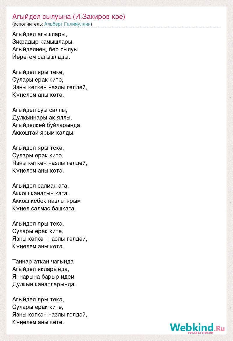 Агыйдел агышлары, Зифадыр камышлары. Агыйделнең, бер сылуы Йөрәгем сагышлады. Агыйдел яры текә, Сулары ерак китә, Язны көткән назлы гөлдәй, Күңелем аны көтә. Агыйдел суы саллы, Дулкыннары ак яллы. Агыйделкәй буйларында Аккоштай ярым калды. Агыйдел яры текә, Сулары ерак китә, Язны көткән назлы гөлдәй, Күңелем аны көтә. Агыйдел салмак ага, Аккош канатын кага. Аккош кебек назлы ярым Күңел салмас башкага. Агыйдел яры текә, Сулары ерак китә, Язны көткән назлы гөлдәй, Күңелем аны көтә. Таңнар аткан чагында Агыйдел якларында, Яннарына барыр идем Дулкын канатларында. Агыйдел яры текә, Сулары ерак китә, Язны көткән назлы гөлдәй, Күңелем аны көтә.