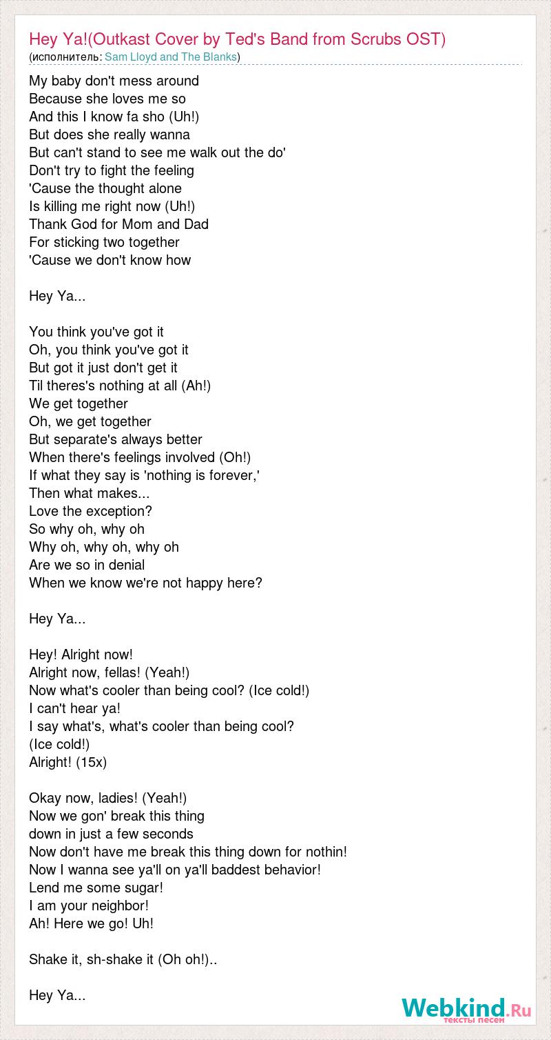 My baby don't mess around Because she loves me so And this I know fa sho (Uh!) But does she really wanna But can't stand to see me walk out the do' Don't try to fight the feeling 'Cause the thought alone Is killing me right now (Uh!) Thank God for Mom and Dad For sticking two together 'Cause we don't know how Hey Ya... You think you've got it Oh, you think you've got it But got it just don't get it Til theres's nothing at all (Ah!) We get together Oh, we get together But separate's always better When there's feelings involved (Oh!) If what they say is 'nothing is forever,' Then what makes... Love the exception? So why oh, why oh Why oh, why oh, why oh Are we so in denial When we know we're not happy here? Hey Ya... Hey! Alright now! Alright now, fellas! (Yeah!) Now what's cooler than being cool? (Ice cold!) I can't hear ya! I say what's, what's cooler than being cool? (Ice cold!) Alright! (15x) Okay now, ladies! (Yeah!) Now we gon' break this thing down in just a few seconds Now don't have me break this thing down for nothin! Now I wanna see ya'll on ya'll baddest behavior! Lend me some sugar! I am your neighbor! Ah! Here we go! Uh! Shake it, sh-shake it (Oh oh!).. Hey Ya...