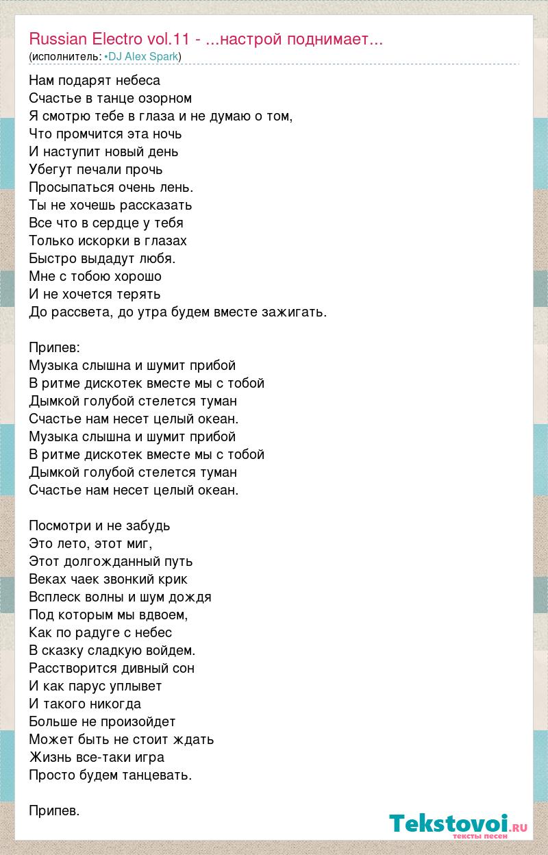 Нам подарят небеса Счастье в танце озорном Я смотрю тебе в глаза и не думаю о том, Что промчится эта ночь И наступит новый день Убегут печали прочь Просыпаться очень лень. Ты не хочешь рассказать Все что в сердце у тебя Только искорки в глазах Быстро выдадут любя. Мне с тобою хорошо И не хочется терять До рассвета, до утра будем вместе зажигать. Припев: Музыка слышна и шумит прибой В ритме дискотек вместе мы с тобой Дымкой голубой стелется туман Счастье нам несет целый океан. Музыка слышна и шумит прибой В ритме дискотек вместе мы с тобой Дымкой голубой стелется туман Счастье нам несет целый океан. Посмотри и не забудь Это лето, этот миг, Этот долгожданный путь Веках чаек звонкий крик Всплеск волны и шум дождя Под которым мы вдвоем, Как по радуге с небес В сказку сладкую войдем. Расстворится дивный сон И как парус уплывет И такого никогда Больше не произойдет Может быть не стоит ждать Жизнь все-таки игра Просто будем танцевать. Припев.