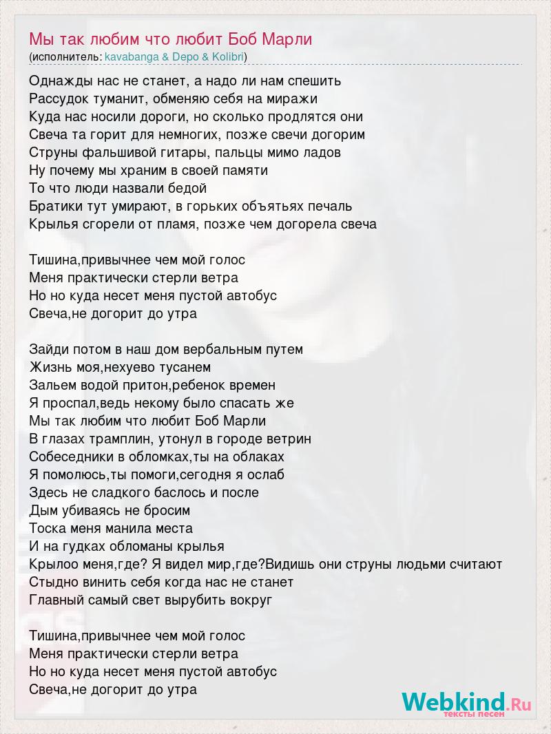 Однажды нас не станет, а надо ли нам спешить Рассудок туманит, обменяю себя на миражи Куда нас носили дороги, но сколько продлятся они Свеча та горит для немногих, позже свечи догорим Струны фальшивой гитары, пальцы мимо ладов Ну почему мы храним в своей памяти То что люди назвали бедой Братики тут умирают, в горьких объятьях печаль Крылья сгорели от пламя, позже чем догорела свеча Тишина,привычнее чем мой голос Меня практически стерли ветра Но но куда несет меня пустой автобус Свеча,не догорит до утра Зайди потом в наш дом вербальным путем Жизнь моя,нехуево тусанем Зальем водой притон,ребенок времен Я проспал,ведь некому было спасать же Мы так любим что любит Боб Марли В глазах трамплин, утонул в городе ветрин Собеседники в обломках,ты на облаках Я помолюсь,ты помоги,сегодня я ослаб Здесь не сладкого баслось и после Дым убиваясь не бросим Тоска меня манила места И на гудках обломаны крылья Крылоо меня,где? Я видел мир,где?Видишь они струны людьми считают Стыдно винить себя когда нас не станет Главный самый свет вырубить вокруг Тишина,привычнее чем мой голос Меня практически стерли ветра Но но куда несет меня пустой автобус Свеча,не догорит до утра