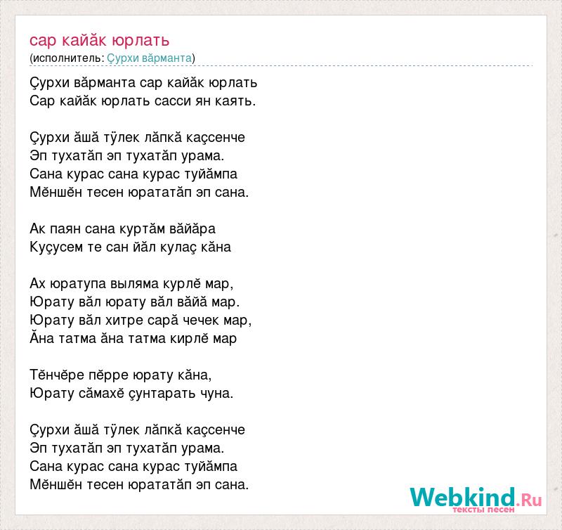 Çурхи вăрманта сар кайăк юрлать Сар кайăк юрлать сасси ян каять. Çурхи ăшă тÿлек лăпкă каçсенче Эп тухатăп эп тухатăп урама. Сана курас сана курас туйăмпа Мĕншĕн тесен юрататăп эп сана. Ак паян сана куртăм вăйăра Куçусем те сан йăл кулаç кăна Ах юратупа выляма курлĕ мар, Юрату вăл юрату вăл вăйă мар. Юрату вăл хитре сарă чечек мар, Ăна татма ăна татма кирлĕ мар Тĕнчĕре пĕрре юрату кăна, Юрату сăмахĕ çунтарать чуна. Çурхи ăшă тÿлек лăпкă каçсенче Эп тухатăп эп тухатăп урама. Сана курас сана курас туйăмпа Мĕншĕн тесен юрататăп эп сана.