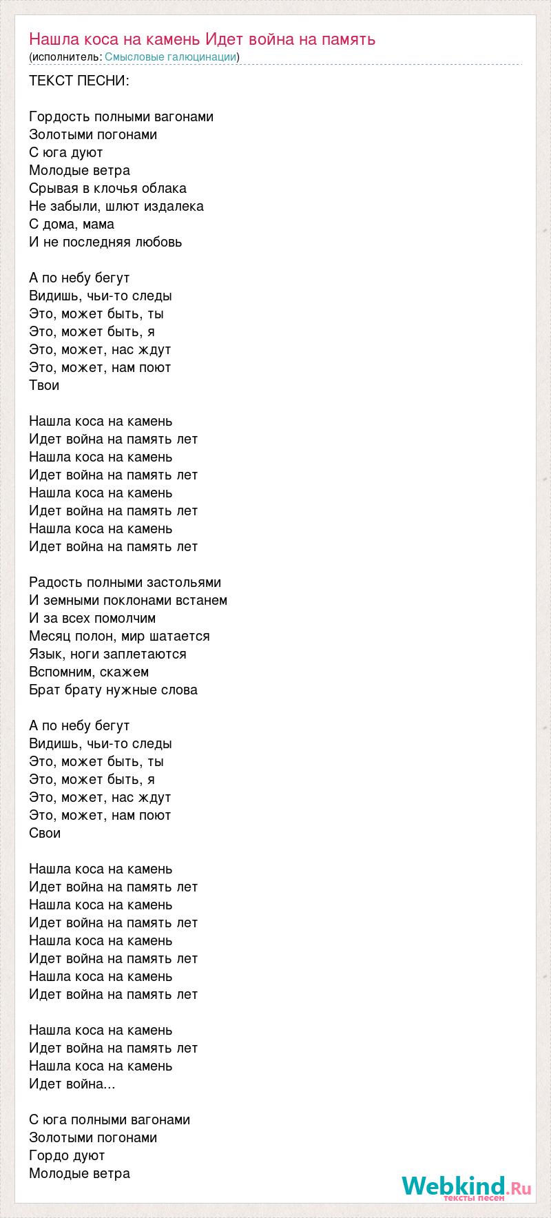 ТЕКСТ ПЕСНИ: Гордость полными вагонами Золотыми погонами С юга дуют Молодые ветра Срывая в клочья облака Не забыли, шлют издалека С дома, мама И не последняя любовь А по небу бегут Видишь, чьи-то следы Это, может быть, ты Это, может быть, я Это, может, нас ждут Это, может, нам поют Твои Нашла коса на камень Идет война на память лет Нашла коса на камень Идет война на память лет Нашла коса на камень Идет война на память лет Нашла коса на камень Идет война на память лет Радость полными застольями И земными поклонами встанем И за всех помолчим Месяц полон, мир шатается Язык, ноги заплетаются Вспомним, скажем Брат брату нужные слова А по небу бегут Видишь, чьи-то следы Это, может быть, ты Это, может быть, я Это, может, нас ждут Это, может, нам поют Свои Нашла коса на камень Идет война на память лет Нашла коса на камень Идет война на память лет Нашла коса на камень Идет война на память лет Нашла коса на камень Идет война на память лет Нашла коса на камень Идет война на память лет Нашла коса на камень Идет война... С юга полными вагонами Золотыми погонами Гордо дуют Молодые ветра