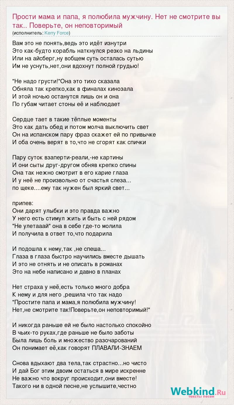 А как ты думаешь, о чем песня "Прости мама и папа, я полюбила мужчину. Нет не смотрите вы так.. Повер" ?