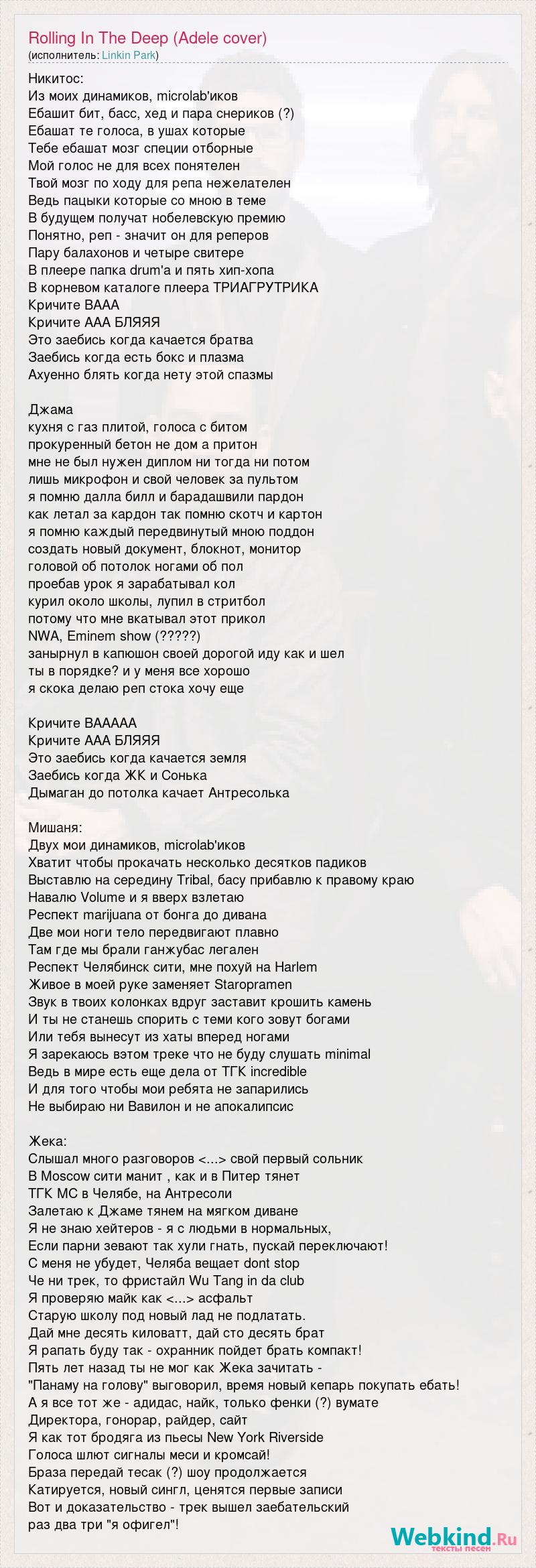 Никитос: Из моих динамиков, microlab'иков Ебашит бит, басс, хед и пара снериков (?) Ебашат те голоса, в ушах которые Тебе ебашат мозг специи отборные Мой голос не для всех понятелен Твой мозг по ходу для репа нежелателен Ведь пацыки которые со мною в теме В будущем получат нобелевскую премию Понятно, реп - значит он для реперов Пару балахонов и четыре свитере В плеере папка drum'а и пять хип-хопа В корневом каталоге плеера ТРИАГРУТРИКА Кричите ВААА Кричите ААА БЛЯЯЯ Это заебись когда качается братва Заебись когда есть бокс и плазма Ахуенно блять когда нету этой спазмы Джама кухня с газ плитой, голоса с битом прокуренный бетон не дом а притон мне не был нужен диплом ни тогда ни потом лишь микрофон и свой человек за пультом я помню далла билл и барадашвили пардон как летал за кардон так помню скотч и картон я помню каждый передвинутый мною поддон создать новый документ, блокнот, монитор головой об потолок ногами об пол проебав урок я зарабатывал кол курил около школы, лупил в стритбол потому что мне вкатывал этот прикол NWA, Eminem show (?????) занырнул в капюшон своей дорогой иду как и шел ты в порядке? и у меня все хорошо я скока делаю реп стока хочу еще Кричите ВААААА Кричите ААА БЛЯЯЯ Это заебись когда качается земля Заебись когда ЖК и Сонька Дымаган до потолка качает Антресолька Мишаня: Двух мои динамиков, microlab'иков Хватит чтобы прокачать несколько десятков падиков Выставлю на середину Tribal, басу прибавлю к правому краю Навалю Volume и я вверх взлетаю Респект marijuana от бонга до дивана Две мои ноги тело передвигают плавно Там где мы брали ганжубас легален Респект Челябинск сити, мне похуй на Harlem Живое в моей руке заменяет Staropramen Звук в твоих колонках вдруг заставит крошить камень И ты не станешь спорить с теми кого зовут богами Или тебя вынесут из хаты вперед ногами Я зарекаюсь вэтом треке что не буду слушать minimal Ведь в мире есть еще дела от ТГК incredible И для того чтобы мои ребята не запарились Не выбираю ни Вавилон и не апокалипсис Жека: Слышал много разговоров <...> свой первый сольник В Moscow сити манит , как и в Питер тянет ТГК МС в Челябе, на Антресоли Залетаю к Джаме тянем на мягком диване Я не знаю хейтеров - я с людьми в нормальных, Если парни зевают так хули гнать, пускай переключают! С меня не убудет, Челяба вещает dont stop Че ни трек, то фристайл Wu Tang in da club Я проверяю майк как <...> асфальт Старую школу под новый лад не подлатать. Дай мне десять киловатт, дай сто десять брат Я рапать буду так - охранник пойдет брать компакт! Пять лет назад ты не мог как Жека зачитать - "Панаму на голову" выговорил, время новый кепарь покупать ебать! А я все тот же - адидас, найк, только фенки (?) вумате Директора, гонорар, райдер, сайт Я как тот бродяга из пьесы New York Riverside Голоса шлют сигналы меси и кромсай! Браза передай тесак (?) шоу продолжается Катируется, новый сингл, ценятся первые записи Вот и доказательство - трек вышел заебательский раз два три "я офигел"!