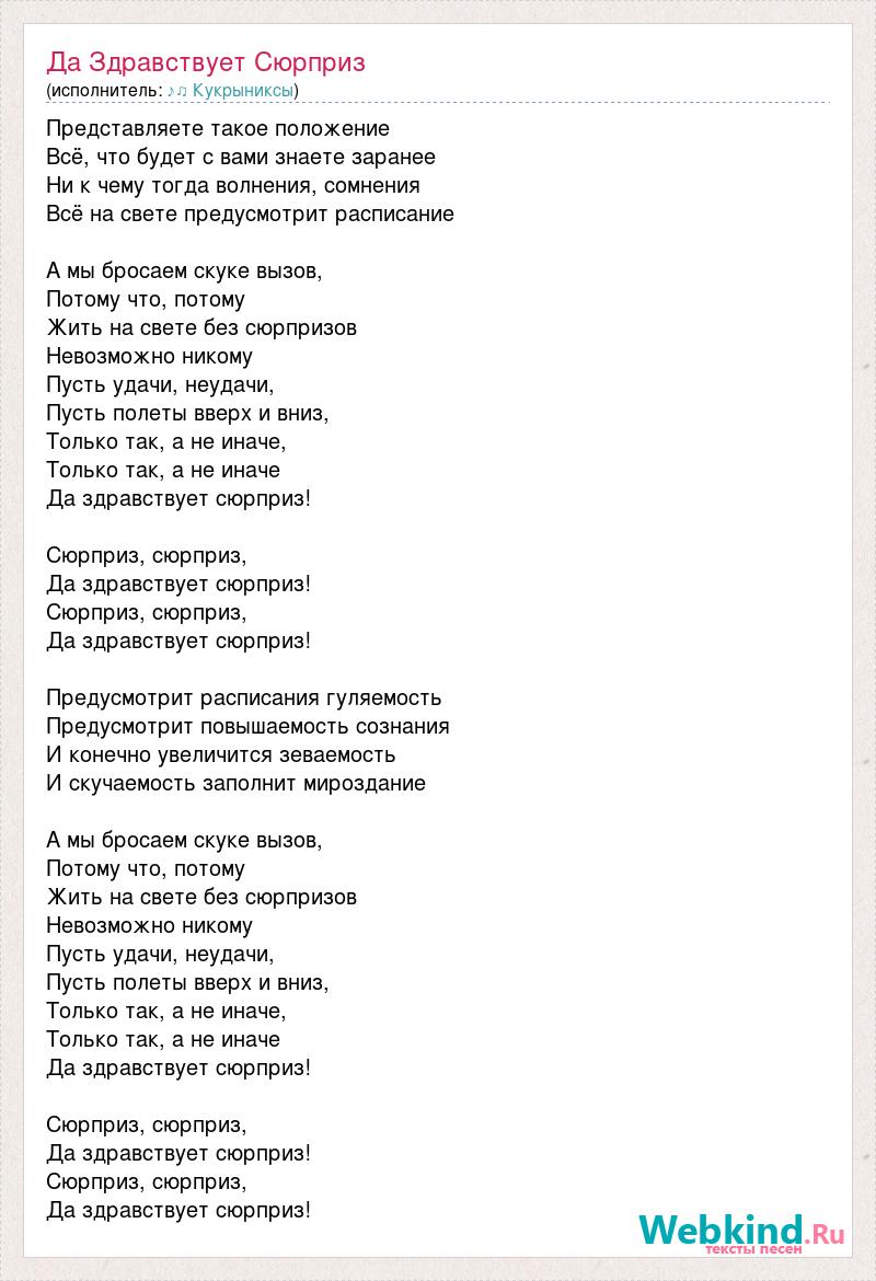 Представляете такое положение Всё, что будет с вами знаете заранее Ни к чему тогда волнения, сомнения Всё на свете предусмотрит расписание А мы бросаем скуке вызов, Потому что, потому Жить на свете без сюрпризов Невозможно никому Пусть удачи, неудачи, Пусть полеты вверх и вниз, Только так, а не иначе, Только так, а не иначе Да здравствует сюрприз! Сюрприз, сюрприз, Да здравствует сюрприз! Сюрприз, сюрприз, Да здравствует сюрприз! Предусмотрит расписания гуляемость Предусмотрит повышаемость сознания И конечно увеличится зеваемость И скучаемость заполнит мироздание А мы бросаем скуке вызов, Потому что, потому Жить на свете без сюрпризов Невозможно никому Пусть удачи, неудачи, Пусть полеты вверх и вниз, Только так, а не иначе, Только так, а не иначе Да здравствует сюрприз! Сюрприз, сюрприз, Да здравствует сюрприз! Сюрприз, сюрприз, Да здравствует сюрприз!