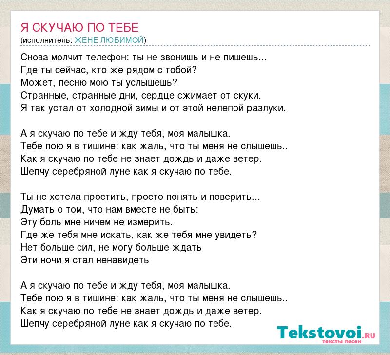 Снова молчит телефон: ты не звонишь и не пишешь... Где ты сейчас, кто же рядом с тобой? Может, песню мою ты услышешь? Странные, странные дни, сердце сжимает от скуки. Я так устал от холодной зимы и от этой нелепой разлуки. А я скучаю по тебе и жду тебя, моя малышка. Тебе пою я в тишине: как жаль, что ты меня не слышешь.. Как я скучаю по тебе не знает дождь и даже ветер. Шепчу серебряной луне как я скучаю по тебе. Ты не хотела простить, просто понять и поверить... Думать о том, что нам вместе не быть: Эту боль мне ничем не измерить. Где же тебя мне искать, как же тебя мне увидеть? Нет больше сил, не могу больше ждать Эти ночи я стал ненавидеть А я скучаю по тебе и жду тебя, моя малышка. Тебе пою я в тишине: как жаль, что ты меня не слышешь.. Как я скучаю по тебе не знает дождь и даже ветер. Шепчу серебряной луне как я скучаю по тебе.